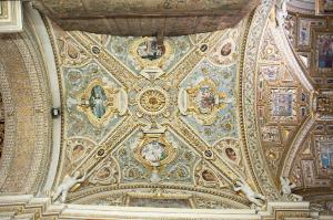 Decorazione pittorica della volta della prima campata della navatella a sinistra del presbiterio: all'interno di finte ancone decorate con volute, due figure femminili alate con funzione di cariatide ai lati e una figura femminile alata in basso al centro da cui partono motivi a girali sono inseriti quattro affreschi raffiguranti episodi della vita di Gesù Cristo (Orazione di Cristo nell'orto di Getsemani, Ultima cena, Cristo davanti a Pilato, Bacio di Giuda).