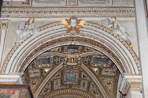 Decorazione plastica della mostra d'arco: teoria di ovoli interrotta al centro da una testina d'angelo. Sopra, sia a destra che a sinistra, due sibille.