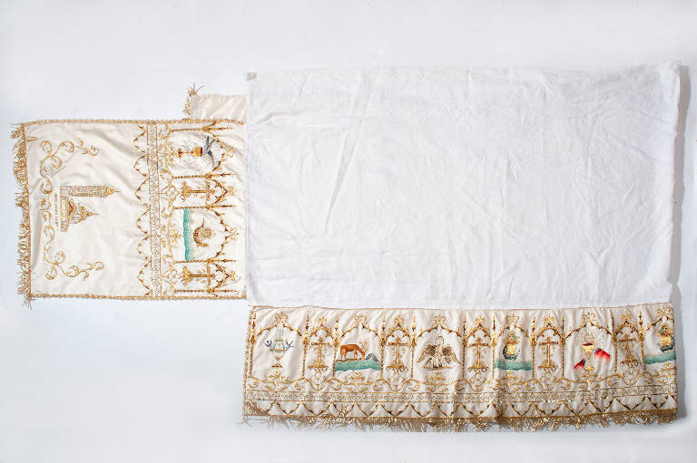 Tovaglia d'altare in lino e raso. Il ricamo, eseguito in seta, oro filato e canutiglia oro con applicazione di paillettes, si sviluppa nelle balze e consiste in simboli eucaristici inseriti all'interno di archi goticheggianti. I bordi sono rifiniti da piccoli galloni eseguiti a fuselli in oro filato e oro laminato.