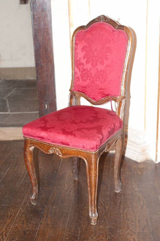 Serie di quattro sedie in legno di noce: gambe leggermente arcuate; schienale inclinato ornato in alto da un motivo vegetale ad intaglio; seduta e schienale in seta damascata di color rosso.