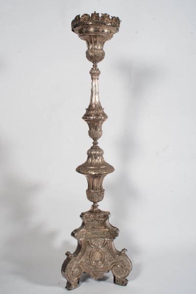 Sei candelieri d'altare in rame argentato. Piedini a volute arricciate; piede trapezoidale decorato con volute, medaglie ovali, foglie acantiformi, fiori e valve di conchiglia; fusto con doppio nodo strozzato e scanalato ornato nella parte inferiore da foglie lanceolate; bocciolo scanalato con teoria di foglie lanceolate.