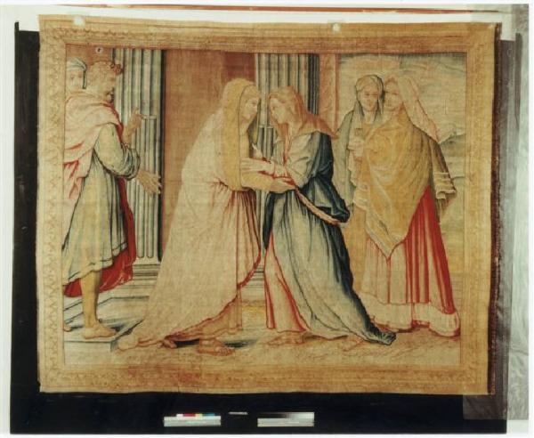 - NOTIZIE STORICO CRITICHE L'arazzo, che raffigura l'episodio della "Visitazione", appartiene alla serie convenzionalmente detta "fiorentina", realizzata nelle Manifatture Medicee, per incarico della MIA, tra il 1583 e il 1586 e interamente dedicata alla vita della Vergine.\nNel 1580 i deputati della Misericordia Maggiore decisero infatti di dotare la Basilica di arazzi destinati ad ornare l'edificio nelle occasioni solenni, risparmiando così le cifre ingenti che si spendevano per gli apparati effimeri: per il tramite di Girolamo Biffi, uomo d'affari bergamasco d'origine ma da anni residente a Firenze, si presero dunque contatti con il Granduca di Toscana, per ottenere i permessi necessari, e con l'Arazzeria Medicea per l'esecuzione; i cartoni furono affidati ad Alessandro Allori e alla sua bottega, la tessitura a Benedetto Squilli di Michele (Meli, 1962, pp. 24-37). Gli arazzi giunsero a Bergamo in tre consegne successive: nel 1583 la "Natività", l'"Adorazione dei Magi" e la "Fuga in Egitto", tra il 1584 e il 1585 l'"Annunciazione", lo "Sposalizio della Vergine", la "Visitazione", la "Circoncisione" e l'"Assunzione della Vergine"; infine, nel 1586, la "Presentazione della Vergine al tempio" (Meli, cit.). \nL'opera ha subito un complesso intervento di restauro tra il 2000 e il 2008, curato dalla scuola di Botticino (cfr. pratica n. 685, cat. 5, clas. 7, fasc. 4, Archivio Congregazione Misericordia Maggiore, Bergamo).\nAttualmente l'arazzo si trova ancora in deposito presso la scuola di Botticino in attesa di una sua definitiva collocazione.