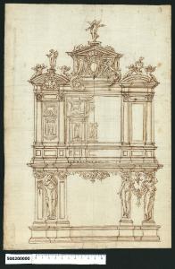 - NOTIZIE STORICO CRITICHE Nell'"Indice de due Tomi d'Intagli Tempietti ed altro", relativo ai tomi V e VI e compilato dal collezionista Giacomo Sardini, il disegno viene iscritto nel paragrafo "Gabinetti" con la definizione "2 In due maniere con statue".\nIl disegno rappresentato è inserito da L. Fairbairn (Fairbairn, 1998 vol. II, Appendix 8, p. 771) oltre che tra le credenze e gli armadi, tra i tabernacoli di Giovanni Battista Montano ed è attribuito allo stesso autore come "gabinetto" da V. Pracchi, su segnalazione di A. Bedon (Pracchi, 1991 pp. 10, 12). L'interpretazione del soggetto non è immediatamente percepibile. \nLa definizione di "gabinetto", assegnata da Sardini, si riferisce a un piccolo mobile o stipo, che doveva avere un congegno di apertura dove si trova l'iscrizione; la definizione di "tabernacolo" non sembra applicabile per la mancanza di elementi iconografici che evochino l'immagine del SS. Sacramento o di Cristo.\nIl disegno sembrerebbe comunque una variante più elaborata del disegno di cui all'inv. 5,3 della Collezione, indicato da Giacomo Sardini con lo stesso soggetto.\nL'impalcato è a due piani sormontati da un elemento centrale conclusivo e le sue parti sembrano regolate da rapporti proporzionali. Nello stesso disegno sono presentate due versioni divise dalla mezzeria, che differiscono nei sostegni del piano inferiore e negli elementi ornamentali conclusivi, mentre il secondo livello, definito in dettaglio a sinistra, è tracciato solo negli elementi architettonici a destra, probabilmente perché non era prevista variazione nelle parti decorative.\nAl piano inferiore, sopra una robusta base sagomata, è proposta a sinistra un'erma (maschile) nuda con drappeggio posteriore e braccia incrociate sul petto, affiancata da due lesene con specchiature, di cui la sinistra decorata con un pendente, concluse da un capitello con volute ioniche che si dipartono da una testa leonina e collegate da un drappo.\nNella variante sul lato destro due erme nude (una maschile e una femminile) con drappeggio posteriore, sono impostate davanti alle lesene e le volute ioniche del capitello si dipartono dalle loro teste. Le due figure sorreggono una ghirlanda appoggiata sulle loro spalle, il cui pendente centrale è riproposto nello spazio superiore tra le loro teste. Un motivo con una testina tra volute vegetali contrapposte e rovesciate, si trova appeso alla cornice superiore della larga campitura vuota al centro. Gli elementi sopra descritti sostengono una robusta cornice sagomata, su cui poggia il basamento articolato e riquadrato del secondo livello, la cui composizione prevede due campiture laterali, inquadrate da semicolonne corinzie corrispondenti ai sostegni inferiori e una campitura centrale di forma pressoché quadrata, corrispondente alla sottostante. \nGli elementi decorativi, definiti come si è detto solo nella metà di sinistra del disegno, sono costituiti nella campitura laterale da un'edicola con frontone triangolare e statua in nicchia semicircolare, sormontato da una riquadratura ornata e da una semplice tra i capitelli. Nella campitura centrale si trova un'edicola con frontone curvilineo e statua in nicchia semicircolare, sormontata da una riquadratura sovrapposta, cui è affiancata una struttura ad arco con frontone triangolare al cui centro sono poste due figure abbracciate su piedistallo.\nGli elementi ornamentali superiori conclusivi delle campiture laterali sono costituiti da due frontoni curvilinei spezzati alla base, di cui quello a sinistra contiene il mezzo busto di un angelo con ali aperte e sostiene al centro una figura su piedestallo con in mano un'urna, affiancata da due angeli seduti sul frontone. Nello stesso motivo a destra, tra i due angeli è posta un'urna fumante sempre su piedistallo. La conclusione della campitura centrale è pure presentata in due varianti decorative: il corpo rettangolare emergente contiene al centro lo stemma gentilizio sorretto ai lati da angeli e sormontato da una corona sostenuta da un altro angelo al centro del frontone triangolare con cui si conclude la composizione. Sopra di esso un angelo che suona una tromba su piedistallo tra due volute vegetali. La variante è nelle due volute vegetali che reggono il frontone: quella di sinistra scende fino a coprire parte della cornice, mentre quella di destra si appoggia su una sporgenza della stessa.