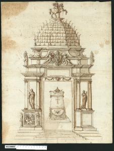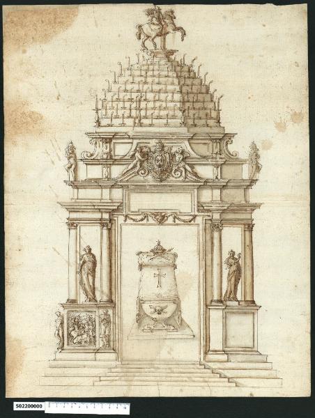 - NOTIZIE STORICO CRITICHE Nell'"Indice de due Tomi d'Intagli Tempietti ed altro", relativo ai tomi V e VI e compilato dal collezionista Giacomo Sardini, il disegno viene iscritto nel paragrafo "Machine da Funerali" con la definizione "21 con statua equestre".\nIl disegno presenta il progetto per un catafalco a forma di tempietto. Questo tipo di apparato funebre effimero si è sviluppato in Roma nella seconda metà del XVI secolo. Gli esempi più noti sono: il Catafalco per il cardinale Alessandro Farnese, costruito nel 1589 sotto la cupola della chiesa del Gesù da Girolamo Rainaldi (che ne fece una descrizione dettagliata) o forse più probabilmente dal suo maestro Domenico Fontana, su modello del tempietto di San Pietro in Montorio; il Catafalco per Sisto V, costruito nel 1591 da Domenico Fontana con Giovanni Guerra in Santa Maria Maggiore, la cui cupola richiama quella di San Pietro in Vaticano; il solenne Catafalco per Paolo V (1622) costruito nella Basilica di S. Maria Maggiore su idea di Sergio Venturi e quello per il principe Carlo Barberini, fratello di Urbano VIII, realizzato nel 1630 su progetto di Gian Lorenzo Bernini, in cui la struttura architettonica razionalmente strutturata è subordinata alla decorazione scultorea (cfr. M. Fagiolo, Atlante tematico del Barocco in Italia, Roma 2007).\nIl disegno è inserito da Lynda Fairbairn tra quelli appartenenti a Giovanni Battista Montano (Fairbairn, 1998 vol. II, Appendix 8, p. 770). \nV. Pracchi, che attribuisce il disegno in forma dubitativa a Montano su indicazione di A. Bedon, rileva la somiglianza con il catafalco costruito nel 1622 per le esequie celebrate nella Basilica di S. Maria Maggiore in onore di Paolo V, ideato da Sergio Venturi (Pracchi, 1991 pp. 11, 14). Tale catafalco, realizzato da Giovanni Battista Soria, che fu allievo di Montano e ne pubblicò le opere, presentava però 36 sculture di Gian Lorenzo Bernini e non corrispondeva nelle fattezze a quello qui raffigurato.\nNel disegno si rilevano delle incongruenze di rappresentazione. Il volume dovrebbe essere a pianta quadrata con un'unica scalinata di accesso inserita nel basamento a gradoni più alti e stretti lateralmente. Il sarcofago visto in prospettiva appare però sospeso come se fosse dipinto nella riquadratura centrale, che non presenta segni o ombreggiature di profondità. Anche la campitura tra le due colonne di sinistra, al centro della quale si erge la statua di una figura femminile drappeggiata, sembrerebbe in muratura piena, per la presenza di una leggera ombreggiatura superiore e laterale, mentre quella di destra, posta in ombra piena, non risulta acquerellata e pertanto la statua di figura femminile posta al suo centro potrebbe stagliarsi su uno sfondato.\nIl basamento su cui si ergono le colonne a sinistra è decorato da statue addossate e da un bassorilievo raffigurante una battaglia di cavalleria, mentre quello a destra è privo di decorazioni. Le ipotesi potrebbero essere due: la rappresentazione di due varianti progettuali o l'omissione per la ripetibilità del motivo in maniera simmetrica.\nNell'immagine centrale il catafalco, su cui è effigiato un teschio con ossa incrociate simbolo della morte, è posto su una base e ricoperto da un drappo con croce cavalleresca e cuscino con nappe su cui sono posati lo scettro e la spada insieme a una corona. La riquadratura sagomata che contiene l'immagine riporta nella parte superiore una decorazione con testina di cherubino tra due drappi sostenuti dalle ali. Sopra di essa una riquadratura sagomata per iscrizione a sua volta sovrastata dallo stemma della famiglia, caratterizzato dai tre gigli centrali, sostenuto da due angeli seduti su volute contrapposte che compongono una sorta di frontone. Ai lati la struttura muraria digrada verso l'alto su tre livelli individuati da cornici aggettanti, fino all'imposta della copertura: una cupola ottagonale gradonata ricoperta da candele fiammeggianti, che sostiene la statua a tutto tondo del cavaliere in arme. \nSulla cornice del secondo livello ai lati del frontone si trovano due candelieri, mentre sui bordi esterni sono due figure aggrappate a sostegni. Sulla cornice del terzo livello sono poste delle mensole a voluta rovescia a sostegno della cornice d'imposta della cupola.\nNon è stato possibile attribuire il disegno e identificare con certezza il personaggio per cui viene ideato l'apparato funerario, tuttavia lo stemma gentilizio riporta i tre gigli di Francia e il regnante era coinvolto nelle battaglie europee del XVI-XVII secolo. La tipolgia della cupola gradonata coperta di candele si ritrova in diversi catafalchi per esequie in S. Lorenzo a Firenze. Perciò potrebbe trattarsi di un progetto, non realizzato, per il catafalco di Enrico IV di Francia, imparentato coi Farnese, cui furono fatte solenni esequie in S. Lorenzo a Firenze nel 1610. Lo stemma e il copricapo richiamano quelli inseriti nel portale di cui all'inv. 5,34 della presente collezione (Milano, Collezione Sardini Martinelli).
