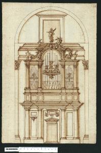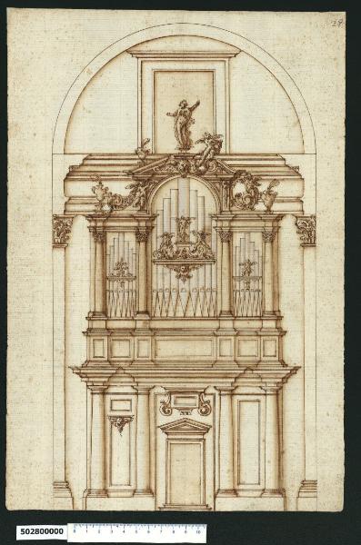 - NOTIZIE STORICO CRITICHE Nell'"Indice de due Tomi d'Intagli Tempietti ed altro", relativo ai tomi V e VI e compilato dal collezionista Giacomo Sardini, il disegno viene iscritto nel paragrafo "Organi" con la definizione "27 a due ordini di colonne".\nQuesta cantoria d'organo è attribuita a Giovanni Battista Montano da V. Pracchi su segnalazione di A. Bedon (Pracchi, 1991 p. 14) e da L. Fairbairn (Fairbairn, 1998 vol. II, Appendix 8, p. 771). \nLa composizione è inserita in un'arcata a tutto sesto, impostata su un imponente cornicione sagomato, sorretto da semicolonne corinzie. La struttura portante della cantoria, centrata rispetto a una porta con frontone triangolare rialzata su due gradini, è costituita da due coppie di semicolonne doriche su unico basamento, inframmezzate da riquadrature (unica a destra e sdoppiata a sinistra, di cui quella più alta decorata con testina di cherubino) che sorreggono un alto cornicione sagomato e articolato, sotto il quale, in corrispondenza della porta, è situata una cornice per iscrizione affiancata da due volute e sorretta da dentelli.\nSopra il cornicione si eleva il basamento a riquadrature con cornici e fascia superiori, che porta le esili semicolonne corinzie tra cui sono poste le canne dell'organo. La strutture lignea si conclude a livello del cornicione d'imposta dell'arcata con una trabeazione sulle campiture ai lati e un arco a tutto sesto in quella centrale. \nLa decorazione superiore, come in molte altre opere di Montano, è presentata in due versioni secondo la mezzeria: sul lato sinistro del disegno, l'arco centrale è sormontato da un frontone triangolare spezzato con urna fumante superiore, sorretto col capo da un putto alato accovacciato e aggrappato al motivo vegetale a voluta laterale; a destra un frontone spezzato a voluta è sorretto da un piedritto affiancato da motivo vegetale a voluta, su cui è seduto un putto alato. Tra i due frontoni, in corrispondenza del culmine dell'arco sottostante, è una testa di cherubino tra un'ala a sinistra e una ghirlanda a destra.\nSopra il cornicione di imposta dell'arcata e al centro della stessa, si trova una finestra incorniciata, su cui si staglia una statua di figura femminile drappeggiata su piedistallo, fiancheggiata da un putto alato seduto sul cornicione. Le canne d'organo centrali sono ornate da una sottile cornice a guisa di mensola sorretta da un cherubino e sormontata da tre putti alati su volute di motivi vegetali. Lo stesso tipo di cornice è ripetuta in tono minore sulle canne d'organo laterali, sorretta da semplice pendente, con un motivo vegetale superiore a sinistra e un putto alato a destra.\nIl disegno può essere confrontato con altri due presenti all'interno della Collezione che potrebbero costituire varianti stesso soggetto (Milano, Collezione Sardini Martinelli invv. 5,52 e 5,53). Un altro esempio di confronto, forse progettato per una chiesa differente, è il disegno di cui all'inv. 5,51. \nAltre cantorie d'organo sono presenti in altri tomi della collezione, ma lo stile dei disegni non sembra associabile a Montano (Ibidem, invv. 1,71 e 1,73).\nLaura Marcucci riferisce che è testimoniata l'attività di Montano nelle cantorie degli organi delle chiese romane di S. Maria di Loreto e della Madonna dei Monti, entrambe inserite in archi (Marcucci, 2008 p. 69). \nUn disegno dell'organo per la chiesa della Madonna dei Monti a Roma, firmato e titolato da F. M. Richino, è conservato alla Biblioteca Ambrosiana (Milano, Biblioteca Ambrosiana, F. 251 inf.) e pubblicato da Cecilia Bocciarelli, che lo considera una delle prime prove dell'architetto, realizzata nei primi anni del '600, quando fu inviato a Roma dal Cardinale Federico Borromeo per un periodo di studi (Bocciarelli, 1972 pp. 76, 110 fig. 1).\nL'organo richiniano è inserito in un'ampia arcata, con centro ribassato, impostata su un massiccio cornicione sporgente. La struttura che sostiene la cantoria, che raggiunge i 2/3 dell'altezza delle colonne laterali e ha le stesse proporzioni dell'elemento superiore, è evidenziata da forti toni chiaroscurali e dall'imponente portale centrale, da cui si diparte una gradonata. La composizione è arricchita rispetto a quella del disegno qui in esame, da campiture laterali con statue in nicchia su entrambi i lati delle tre campiture che racchiudono le canne dello strumento, simili nella configurazione, ma più ristrette. La base di supporto delle canne, pure a riquadrature articolate, risulta sporgente nella parte centrale, per conferire maggiore risalto al portale. Le decorazioni sopra le canne dell'organo sono simili nei due disegni, ma nel disegno richiniano sono allineate tra loro e non sfalsate. L'organo, compreso sotto il cornicione nel disegno di Montano, invade lo spazio dell'arco nel disegno del Richini, comprimendo la riquadratura superiore. Sicuramente vi fu un contatto tra i due artisti, che occorrerebbe approfondire per capire la natura del disegno, le cui figure ornamentali sono stilisticamente molto simili a quelle di Montano.