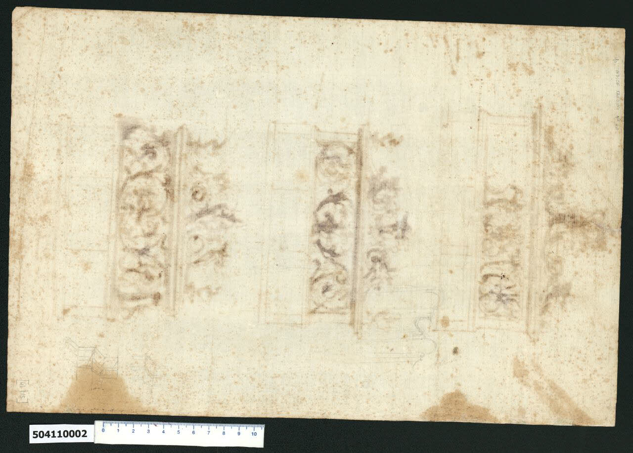 - NOTIZIE STORICO CRITICHE Il disegno è escluso dall'indice di Giacomo Sardini. Sul lato del foglio in esame, in cui traspare il disegno tracciato sul recto, sono presenti tre schizzi a grafite relativi a studi di modanature. Uno di essi, che presenta un profilo a curve concave e convesse, potrebbe riferirsi allo studio per un candeliere o per la base di una colonna.