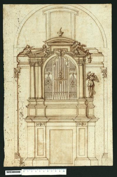 - NOTIZIE STORICO CRITICHE Nell'"Indice de due Tomi d'Intagli Tempietti ed altro", relativo ai tomi V e VI e compilato dal collezionista Giacomo Sardini, il disegno viene iscritto nel paragrafo "Organi" con la definizione "51 come sopra" [si legga: in un coro].\nLa cantoria qui raffigurata, già attribuita a Giovanni Battista Montano da V. Pracchi su segnalazione di A. Bedon (Pracchi, 1991 p. 14) , come indica anche L. Fairbairn (Fairbairn, 1998 vol. II, Appendix 8, p. 771), è inserita in un'arcata a tutto sesto, impostata su un imponente cornicione sagomato sorretto da semicolonne corinzie.\nLa struttura di base portante, al cui centro si trova un'ampia riquadratura, è impostata su un alto zoccolo sagomato ed è rilevata da una parasta per lato scavata da una riquadratura o nicchia per statue e decorata superiormente un motivo vegetale lineare. \nSulla cornice sagomata e aggettante superiore, è impostato il supporto di base dell'organo, che riprende insieme a questa l'articolazione delle paraste sottostanti. Da questo punto il disegno si propone in due versioni decorative ai lati della campitura centrale ad arco a tutto sesto, che contiene in un unico spazio le canne dell'organo di diverse dimensioni, decorate da testine di cherubini, motivi vegetali e dalle consuete mensole a cornice rettilinea che portano, in questo caso, delle urne fumanti. Sul versante sinistro ai lati dell'arco sono impostate due semicolonne corinzie di cui quella più interna avanzata, come è sottolineato anche dalla trabeazione a L soprastante, secondo una soluzione già utilizzata da Montano in altri disegni (Milano, Collezione Sardini Martinelli invv. 5,46; 5,47; 6,39). Sul lato destro è un'unica semicolonna corinzia avanzata, a lato della quale si trova una statua di angelo come su un piedistallo.\nIl culmine dell'arco centrale che contiene l'organo, segnato da due testine di un cherubino sovrapposte, travalica il limite della trabeazione impostata sulle semicolonne laterali, spezzandola. Sulla sinistra un putto alato seduto all'estremità della cornice, si appoggia al cornicione di imposta dell'arcata che racchiude la composizione, conclusa su questo lato da un frontone spezzato curvilineo su cui siede un altro putto alato, mentre a destra è proposto un frontone spezzato a voluta su cui è disteso un angelo dai cui piedi pende un motivo vegetale.\nNella parte centrale sopra l'arco il motivo conclusivo è un basso corpo rettangolare sormontato da un frontone curvilineo, su cui poggia un'urna fumante stagliata sul fondo di un'apertura sagomata, il cui profilo superiore segue la linea dell'arco. \nLaura Marcucci riferisce che è testimoniata l'attività di Montano nelle cantorie degli organi delle chiese romane di S. Maria di Loreto e della Madonna dei Monti, entrambe inserite in archi (Marcucci, 2008 p. 69). \nUn disegno dell'organo per la chiesa della Madonna dei Monti a Roma, firmato e titolato da F. M. Richino, è conservato alla Biblioteca Ambrosiana (Milano, Biblioteca Ambrosiana, F. 251 inf.) e pubblicato da Cecilia Bocciarelli, che lo considera una delle prime prove dell'architetto, realizzata nei primi anni del '600, quando fu inviato a Roma dal Cardinale Federico Borromeo per un periodo di studi (Bocciarelli, 1972 pp. 76, 110 fig. 1). Non è stato possibile stabilire se il presente disegno, quelli di cui agli invv. 5,28 e 5,53 della Collezione e il disegno dell'Ambrosiana riguardino tutti la cantoria di questa chiesa; tuttavia gli studi su alcune analogie meritano di essere approfonditi. \nQuesta composizione è comunque chiaramente una versione semplificata di quelle di cui agli invv. 5,28 e 5,52: la base è semplice e sottomessa rispetto alla cantoria, che risulta più snella e allungata anche per la presenza della campitura incorniciata e sagomata centrata nell'arco, che ne segue la curvatura alla sommità. Gli elementi decorativi e le sculture risultano inoltre più liberi nella composizione.\nUn altro esempio di confronto, forse progettato per una chiesa differente, è il disegno di cui all'inv. 5,51 della presente collezione (Milano, Collezione Sardini Martinelli).\nAltre cantorie d'organo sono presenti in altri tomi della collezione, ma lo stile dei disegni non sembra associabile a Montano (Ibidem, invv. 1,71 e 1,73).