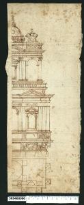 - NOTIZIE STORICO CRITICHE Il disegno è escluso dall'indice di Giacomo Sardini. Il foglio in esame propone il disegno della metà destra di un tabernacolo in forma di tempio, sviluppato in pianta e prospetto. La pianta riporta il disegno costruttivo dell'oggetto sezionato probabilmente appena sopra la zoccolatura di base, anche se la sagoma di questa non compare nella pianta. Si individua invece la sagoma delle mensole a voluta aggettanti di sostegno alla struttura e la proiezione della cupoletta finale (?), con gli elementi interni in legno di irrigidimento dell'impalcato e lo sportello di apertura.\nIl disegno è attribuito in forma dubitativa da V. Pracchi a Giovanni Battista Montano su segnalazione di A. Bedon (Pracchi, 1991 p. 14). Il tabernacolo è tracciato solo a metà in quanto sicuramente il disegno doveva svilupparsi specularmente e risulta incompleto in alcune parti. La grafia, piuttosto incerta, ricorda quella dei disegni di cui agli invv. 5,4 e 5,32 bis della presente collezione (Milano, Collezione Sardini Martinelli), come pure alcune incongruenze tra la pianta e l'alzato. \nIl prospetto si sviluppa immediatamente sopra la pianta in due piani. Oltre la zoccolatura sopra citata, intagliata con motivi decorativi nei pannelli tra le mensole, il primo livello presenta una fascia sempre a pannelli decorati tra due cornici sagomate, su cui si impostano aperture alternate a edicola e ad arco tra semicolonne binate con capitelli corinzi (di cui solo uno disegnato), probabilmente raddoppiate in corrispondenza dello spigolo. Tra i capitelli corre una fascia decorata con lo stesso motivo a festoni vegetali e nastri presente nei pannelli della zoccolatura e sopra di essi la trabeazione con doppia cornice aggettante sostiene un grande frontone triangolare, corrispondente all'apertura ad edicola sottostante, inserito nella struttura del livello superiore.\nQuest'ultima è composta da una fascia con una balaustra solo parzialmente disegnata, sulla quale sono impostate le aperture: più esterna e in asse col frontone quella ad arco aperto, ad alleggerire la composizione e ad edicola con frontone spezzato a volute la successiva più interna. Tra le aperture anche in questo piano sono previste semicolonne binate corinzie, mentre sullo spigolo, arretrato rispetto al filo del piano sottostante, il motivo è semplificato con una semicolonna semplice. Una seconda trabeazione sempre a doppia cornice ma più leggera sostiene un frontone curvilineo sopra l'apertura a edicola e la fascia decorata con pannelli che raccorda gli elementi terminali di copertura. In linea con l'arco è un elemento trapezoidale curvilineo, decorato al centro con una testa di leone e concluso da un frontone curvilineo a volute, inframmezzato da un'urna su piedistallo. A centro è una cupoletta ottagonale circondata da una balaustra, con copertura costolonata a spicchi tra cui sono interposte aperture a oculo. Sulla sommità si intravede una sorta di lanternino con puntone (o croce?) finale.