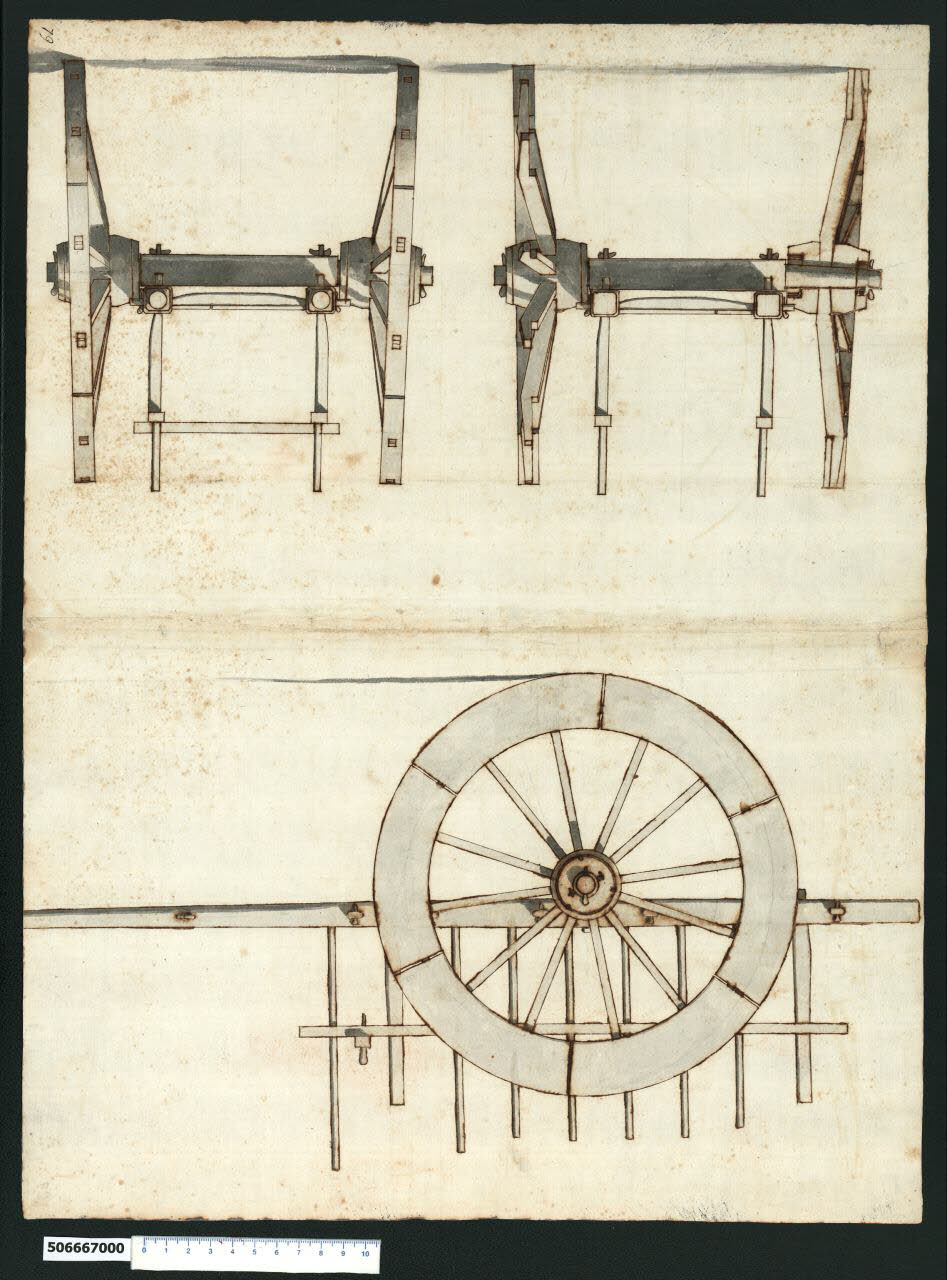 - NOTIZIE STORICO CRITICHE Nell'"Indice de due Tomi d'Intagli Tempietti ed altro", relativo ai tomi V e VI e compilato dal collezionista Giacomo Sardini, il disegno viene iscritto nel paragrafo "Carozze e carette" con la definizione "60 61 Carretta".\nLa rappresentazione di questo carretto da trasporto secondo una vista laterale, una sezione e una vista frontale, inserite su un unico foglio, è accompagnata da un manoscritto che ne descrive dettagliatamente i componenti e le misure adeguate per costruirlo. Dallo scritto si evince anche che si trattava di un mezzo trainato da un cavallo, cui si poteva affiancarne un secondo per il cambio.\nIl disegno, molto accurato sia nella definizione grafica, sia nella rappresentazione dell'oggetto si inserisce in maniera anomala all'interno di un corpus di soggetti di natura del tutto differente quali quelli del tomo V della Collezione Sardini Martinelli. Da un confronto grafologico con altri scritti, tra cui una lettera da Magliano Sabina, datata 20 dic. 1671 e conservata a Ferrara (Ferrara, Biblioteca Comunale Ariostea, Raccolta Cittadella, Autografi n. 1819), si evince che il manoscritto è stato redatto da Agostino Martinelli, nato a Ferrara, ma trasferitosi intorno al 1676 a Roma dove fu lettore di legge alla Sapienza. Matematico e membro della Congregazione dei Virtuosi al Pantheon, nel 1671 fu nominato "perito deputato della Reverenda Camera Apostolica sopra le acque relative al Tevere presso la Magliana" e si occupò dei problemi provocati dalle piene del fiume. \nIl disegno non sembra evocare lo stile di Agostino Martinelli, di cui sono presenti alcune opere all'interno della Collezione (Milano, Collezione Sardini Martinelli invv. 5,60; 5,92; 5,95; 5,96; 5,103), quanto sembra ricordare alcuni disegni di Domenico Martinelli, con cui Agostino sembra sia stato in contatto.Tuttavia non vi sono elementi sufficienti per attribuire il disegno.