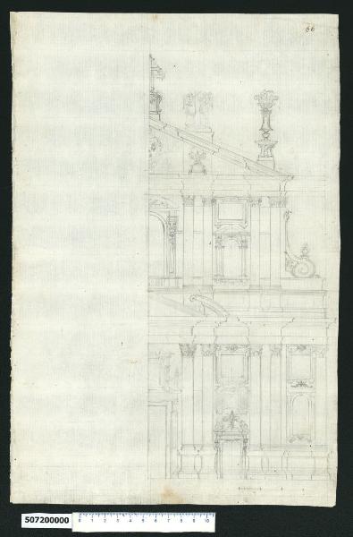 - NOTIZIE STORICO CRITICHE Nell'"Indice de due Tomi d'Intagli Tempietti ed altro", relativo ai tomi V e VI e compilato dal collezionista Giacomo Sardini, il disegno viene iscritto nel paragrafo "Chiese e loro parti" con la definizione "66 Facciata di Chiesa". Nel 1608 Carlo Maderno venne chiamato dal cardinale Alessandro Peretti Montalto a dirigere la fabbrica teatina di S. Andrea della Valle, ancora incompleta di abside, cupola, facciata e di parte della navata. La presenza di Borromini in cantiere è documentata a partire dal marzo 1621 e il suo ruolo nell'elaborazione del progetto della facciata è documentato da sei disegni: Uffizi A 6734, 6743; Albertina Az Roma 118, 119; Oxford, Ashmolean Museum Largest Talman Album X.f.19 e Milano, Collezione Sardini Martinelli inv. 5,72 (Wolfe, Gli esordi ..., 2000, p. 92). Il disegno raffigura la metà destra della facciata a due ordini sovrapposti, suddivisa in tre campate da colonne binate; l'ordine inferiore è dilatato lateralmente con l'aggiunta di due settori raccordati all'ordine superiore mediante piccole volute. Secondo la Wolfe (Francesco Borromini e le committenze ..., 2000, p. 77) il disegno milanese è tratto dal medesimo schema raffigurato in Albertina Az Roma 118., e presenta, nella soluzione delle statue raffiguranti angeli sopra il timpano, analogie con lo schizzo tracciato da Borromini su un disegno della facciata del Santuario della Beata Vergine dei Miracoli di Saronno, progettata da Lelio Buzzi nel 1595 (Ibidem). La studiosa propone a proposito del disegno milanese una datazione successiva al 1623 per la presenza dello stemma di Urbano VIII Barberini, succeduto a Gregorio XV nell'agosto 1623. Oltre a quello papale posto nel timpano, il disegno presenta i gigli fiorentini sopra la porta laterale, e, in posizione subordinata, gli emblemi Peretti (rami con le pere e i leoni) incorporati nelle volute (Ferrara 2003, pp. 46-47) che, sempre secondo la Wolfe, indicano un tentativo di recuperare il progetto per assecondare il desiderio della famiglia papale di fare del S. Andrea una chiesa fiorentina alternativa a quella di S. Giovanni in via Giulia.