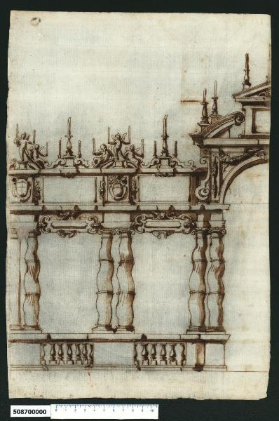 - NOTIZIE STORICO CRITICHE Nell'"Indice de due Tomi d'Intagli Tempietti ed altro", relativo ai tomi V e VI e compilato dal collezionista Giacomo Sardini, il disegno viene iscritto nel paragrafo "Case loro parti" con la definizione "76 Facciata". In realtà il disegno raffigura due campate e mezza di una loggia reggente un'alta trabeazione, ed è attribuito a Giovanni Battista Montano da Valeria Pracchi (1991, 2a parte) su segnalazione di Anna Bedon. La struttura si regge su una sequenza di colonne tortili binate (tranne l'ultima a sinistra che presenta il fusto dritto), in corrispondenza delle quali, nella trabeazione viene inserito uno stemma con le insegne papali, sormontato da un timpano curvilineo decorato con cherubini reggicero. La parte superiore dell'intercolumnio è interamente occupata da un cartiglio accartocciato. Il parapetto è costituito dai basamenti delle colonne alternati da balaustre. Sulle ultime due colonne di destra si imposta un arco (raffigurato solo per metà) sopra il quale è collocato un timpano curvilineo spezzato al centro per ospitare un cartiglio sormontato da timpano triangolare. Il disegno è in rapporto con un altro conservato in Milano, Collezione Sardini Martinelli inv. 4,2.