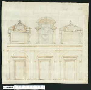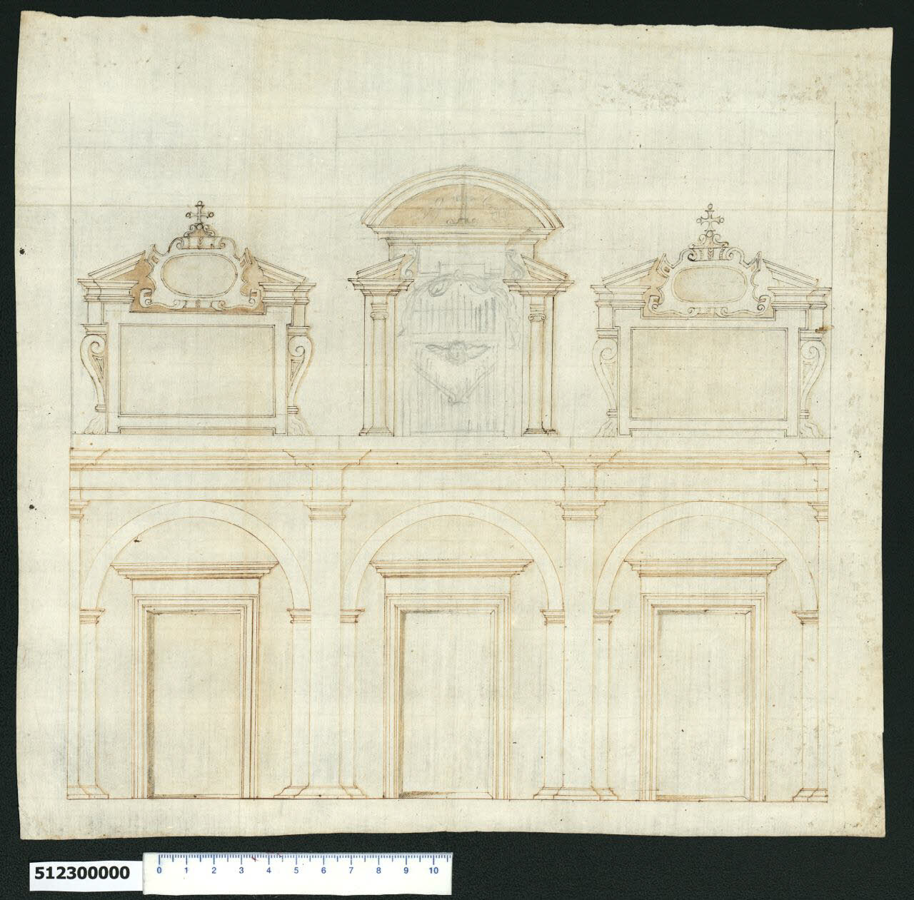 - NOTIZIE STORICO CRITICHE Nell'"Indice de due Tomi d'Intagli Tempietti ed altro", relativo ai tomi V e VI e compilato dal collezionista Giacomo Sardini, il disegno viene iscritto sia nel paragrafo "Chiese e loro parti" con la definizione "107 vedute interne", sia nel paragrafo "Organi" con la numerazione "107".\nIl disegno sembra rappresentare la parete interna di fondo di una chiesa, per la presenza di tre portali (forse tre accessi in facciata) sovrastati da un organo al centro tra due doppie cornici per ornamento e iscrizione ai lati.\nI portali appaiono sullo sfondo di tre arcate a tutto sesto impostate sugli appoggi inferiori di pilastri compositi che, con il sostegno frontale, raggiungono e sorreggono una robusta trabeazione su cui poggiano gli elementi superiori sopra citati. \nLa struttura che contiene le canne d'organo, appena delineate a grafite nella disposizione come nella decorazione con testina di cherubino e fiocco centrali, è costituita da due pilastrini laterali con semicolonne addossate che sostengono un frontone triangolare spezzato, al cui centro si eleva un corpo rettangolare sormontato da un grande frontone curvilineo aggettante. \nLe due cornici laterali sono uguali tra loro e sono costituite da una grande campitura rettangolare con riquadratura sagomata. Gli spigoli superiori allargati di questa, sorreggono un frontone triangolare spezzato al centro del quale è posto il cartiglio per iscrizione, sovrastato da una croce sostenuta da piccole volute. La campitura rettangolare è affiancata da due mensole a voluta allungate e appoggiate alla base con una sorta di frange allargate, che sorreggono un insieme di cornici sagomate arretrate a lato del frontone. \nQuesto elemento è da mettere in relazione con uno simile disegnato sul foglio di cui all'inv. 5,93 della presente collezione (Milano, Collezione Sardini Martinelli), che potrebbe costituirne una variante. Non è stato possibile individuare l'autore del disegno né la eventuale localizzazione della composizione. Si ritiene che lo stile possa associarsi a quello del disegno di cui all'inv. 5,119 della stessa collezione, oltre a quello sopra citato.