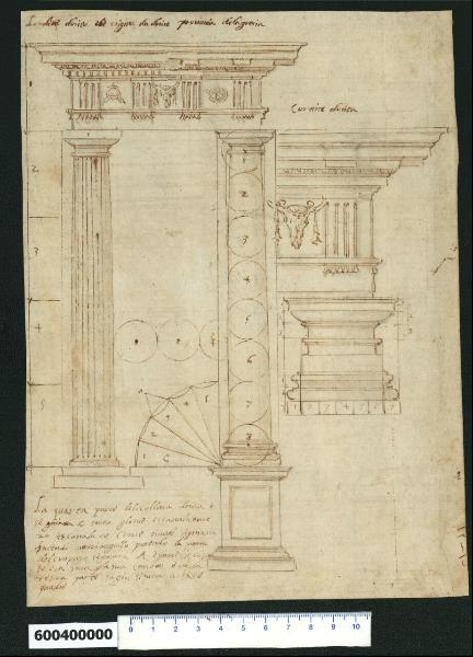- NOTIZIE STORICO CRITICHE Nell'"Indice de due Tomi d'Intagli Tempietti ed altro", relativo ai tomi V e VI e compilato dal collezionista Giacomo Sardini, il disegno viene iscritto nel paragrafo "Ordini d'architettura" con la numerazione "112" sotto voce "Dorico".\nL'attribuzione del disegno a Giovanni Battista Montano fatta da Valeria Pracchi (1991, 2a parte, p. 17) su segnalazione di Anna Bedon, è confermata dalla Fairbairn (1998, cat. 864, pp. 564-565).\nIl disegno raffigura due alternative per la colonna di ordine dorico accostate in modo da creare un intercolumnio. Le colonne, che si presentano liscia a destra e scanalata a sinistra, hanno un'altezza di 8 diametri e sono distanziate 2 diametri e 3/4, e reggono una trabeazione alta un quarto dell'altezza totale. La colonna a destra è posta su un piedistallo e presenta una base attica, mentre quella a sinistra ne è priva; i capitelli differiscono per una maggiore articolazione di quello a destra. La trabeazione ha un architrave con mutuli e il fregio ornato da metope (con bucranio, patera ed elmetto) e triglifi, con differenze a livello della cornice: a destra sono presenti dei modiglioni, mentre a sinistra è raffigurata una sottocornice con dentelli e ovuli, un gocciolatoio liscio e una sima a gola diritta. L'ordine a destra sembra derivare dalla "Regola" del Vignola con piedistallo, base attica e modiglioni nella cornice. Nell'intercolumnio è anche tracciato un quarto della colonna con 5 scanalature per la cui costruzione vengono date indicazioni nella nota a margine.\nIl dettaglio dell'ordine si riferisce alla base che è quella attica, impostata su 7 moduli, dei quali 5 corrispondono al diametro della colonna alla base, perché verso il capitello il fusto si restringe.\nPoco sotto l'echino sono inseriti due collarini. La trabeazione è quella già ricordata ispirata al Vignola.\nUna copia identica del presente disegno è in Milano, Collezione Sardini Martinelli inv. 6,10 recto. Altri elaborati raffiguranti l'ordine dorico, privi però dei particolari architettonici, sono conservati a Londra (Sir John Soane's Museum, in Fairbairn 1998, cat. 863-865, 868; nel disegno cat. 867 è raffigurato anche il dettaglio delle basi), Madrid (Biblioteca Nacional, Album di Giovanni Battista Montano, B 7569) e Parigi (Bibliothèque Nationale de France, "Recueil de dessins d'architecture par Giovanni Battista Montano", ms Hb, 22-4, ff. 131r, 137-138r, 142r, 145r), Oxford (Ashmolean Museum, The Larger Talman Album, fol. 96r).\nNell'opera di De Rossi del 1684 (Li Cinque Libri di Architettura di Gio. Battista Montani milanese. Architettura con diversi ornamenti cavati dall'antico. Libro primo, p. 11) il disegno viene riprodotto senza i particolari architettonici e con la colonna a destra priva di piedistallo; la didascalia a commento dell'incisione ci informa che la colonna scanalata senza base si può vedere nei ruderi del teatro di Marcello.