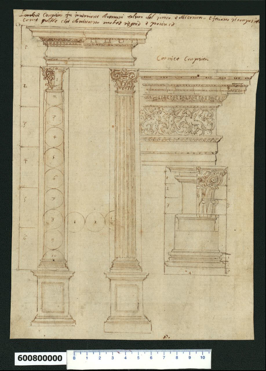 - NOTIZIE STORICO CRITICHE Nell'"Indice de due Tomi d'Intagli Tempietti ed altro", relativo ai tomi V e VI e compilato dal collezionista Giacomo Sardini, il disegno viene iscritto nel paragrafo "Ordini d'architettura" con la numerazione "114" sotto voce "Composito".\nL'attribuzione del disegno a Giovanni Battista Montano è fatta da Valeria Pracchi (1991, 2a parte, p. 17) su segnalazione di Anna Bedon, è confermata dalla Fairbairn (1998, p. 770).\nIl disegno mostra due soluzioni dell'ordine composito con piedistalli: a sinistra la colonna è liscia e regge una trabeazione con architrave a due fasce, con fregio pulvinato, sottocornice a dentelli e ovoli, e cornice a gola rovescia; a destra la colonna è scanalata ed è sormontata da architrave a due fasce, fregio liscio, cornice con modiglioni.\nLe colonne (ad esclusione del piedistallo) sono divise in sei parti, la prima corrispondente alla trabeazione, le rimanenti cinque sono a loro volta divise in dieci moduli corrispondenti al diametro della colonna. L'intercolumnio misura due moduli e mezzo.\nSulla destra del foglio è delineato il particolare della base, capitello e trabeazione; quest'ultima corrisponde a quella della colonna scanalata, con la differenza che qui l'architrave è a tre fasce. Il fregio è decorato con due grifoni e una sirena bicaudata con ali.\nCopia del disegno, priva delle note manoscritte, si trova in Milano, Collezione Sardini Martinelli inv. 6,17 recto. Altri fogli dedicati al medesimo tema sono conservati a Londra (Sir John Soane's Museum, in Fairbairn 1998, cat. 937, 938, 940), Madrid (Biblioteca Nacional, Album di Giovanni Battista Montano, B 7584). Nell'opera di De Rossi del 1684 (Li Cinque Libri di Architettura di Gio. Battista Montani milanese. Architettura con diversi ornamenti cavati dall'antico. Libro primo, p. 32) è presentata un'incisione molto simile al presente disegno.