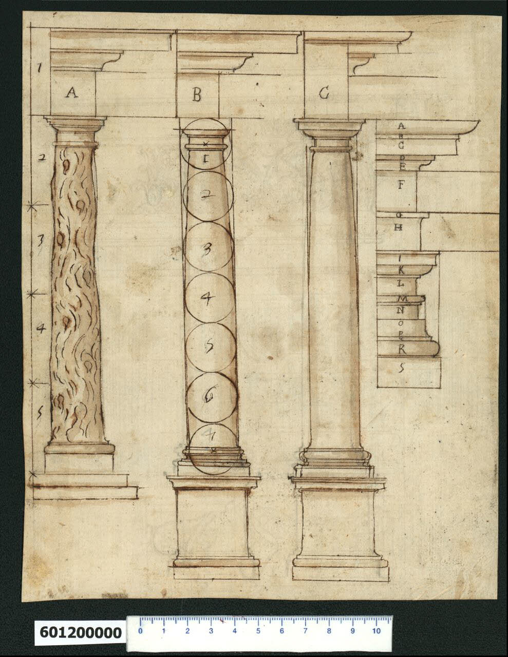 - NOTIZIE STORICO CRITICHE Nell'"Indice de due Tomi d'Intagli Tempietti ed altro", relativo ai tomi V e VI e compilato dal collezionista Giacomo Sardini, il disegno viene iscritto nel paragrafo "Ordini d'architettura" con la numerazione "116".\nL'attribuzione del disegno a Giovanni Battista Montano è fatta da Valeria Pracchi (1991, 2a parte, p. 18) su segnalazione di Anna Bedon, è confermata dalla Fairbairn (1998, p. 771), che lo inserisce tra gli esempi dell'ordine tuscanico, mentre la Pracchi lo individua come dorico. In effetti, il foglio raffigura entrambi gli ordini.\nCome sostiene Rodriguez Ruiz (1991, p. 80, cat. 62) commentando un elaborato analogo conservato a Madrid (Biblioteca Nacional, cat. B 7566), il disegno mostra una sequenza figurativa e concettuale sull'origine degli ordini, secondo una impostazione completamente nuova e insolita per i trattati di architettura del XVI secolo. Sebbene a partire dall'edizione di Vitruvio realizzata da Cesariano nel 1521, fosse usuale commentare l'origine dell'architettura con il modello della capanna, e quindi assegnare l'origine degli ordini al tronco di albero, Montano giunge a un esito di particolare chiarezza pedagogica. La colonna arborea (A) potrebbe essere stata ispirata da esempi ancora visibili, forse dalla stessa colonna a forma di tronco d'albero che Bramante realizzò nella Canonica di S. Ambrogio a Milano alla fine del Quattrocento, e che Montano "milanese", potrebbe aver visto.\nAccanto alla colonna/tronco, è disegnata una colonna dorica (B), seguita da una tuscanica (C). Come ci informano le note presenti sul disegno identico al presente, conservato in Milano, Collezione Sardini Martinelli inv. 6,9 (cfr. scheda), la colonna tuscanica è un'invenzione di Montano, alternativa alla precedente B, "vitruviana", che non apprezza perché "di diminouisse tropo poco per dove forma il capitello". Sul margine destro è tracciato il dettaglio della base, capitello e trabeazione con una legenda esplicativa delle singole parti.\nAltri fogli dedicati al medesimo tema, ma con soluzioni compositive diverse sono conservati a Oxford (Ashmolean Museum, The Larger Talman Album, fol. 86r), Parigi (Bibliothèque Nationale de France, album "Recueil de dessins d'architecture par Giovanni Battista Montano", ms Hb, 22-4, f. 150r), Londra (Sir John Soane's Museum, in Fairbairn 1998, cat. 857, 859, 860).