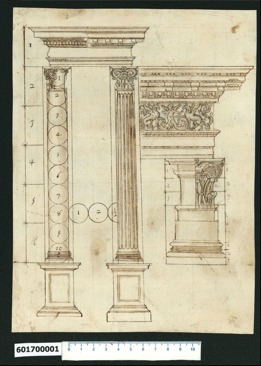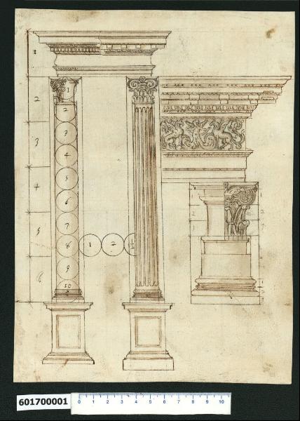 - NOTIZIE STORICO CRITICHE Nell'"Indice de due Tomi d'Intagli Tempietti ed altro", relativo ai tomi V e VI e compilato dal collezionista Giacomo Sardini, il disegno viene iscritto nel paragrafo "Ordini d'architettura" con la numerazione "119".\nL'attribuzione del disegno a Giovanni Battista Montano è fatta da Valeria Pracchi (1991, 2a parte, p. 18) su segnalazione di Anna Bedon, è confermata dalla Fairbairn (1998, p. 770).\nIl disegno mostra due soluzioni dell'ordine composito con piedistalli: a sinistra la colonna è liscia e regge una trabeazione con architrave a due fasce, con fregio pulvinato, sottocornice a dentelli e ovoli, e cornice a gola rovescia; a destra la colonna è scanalata ed è sormontata da architrave a due fasce, fregio liscio, cornice con modiglioni.\nLe colonne (ad esclusione del piedistallo) sono divise in sei parti, la prima corrispondente alla trabeazione, le rimanenti cinque, sono a loro volta divise in dieci moduli corrispondenti al diametro della colonna. L'intercolumnio misura due moduli e mezzo.\nSulla destra del foglio è delineato il particolare della base, capitello e trabeazione; quest'ultima corrisponde a quella della colonna scanalata, con la differenza che qui l'architrave è a tre fasce. Il fregio è decorato con due grifoni e una sirena bicaudata con ali.\nCopia del disegno, corredata da note manoscritte, si trova in Milano, Collezione Sardini Martinelli inv. 6,9. Altri fogli dedicati al medesimo tema sono conservati a Londra (Sir John Soane's Museum, in Fairbairn 1998, cat. 937, 938, 940), Madrid (Biblioteca Nacional, Album di Giovanni Battista Montano, B 7584). Nell'opera di De Rossi del 1684 (Li Cinque Libri di Architettura di Gio. Battista Montani milanese. Architettura con diversi ornamenti cavati dall'antico. Libro primo, p. 32) è riprodotto un disegno molto simile.