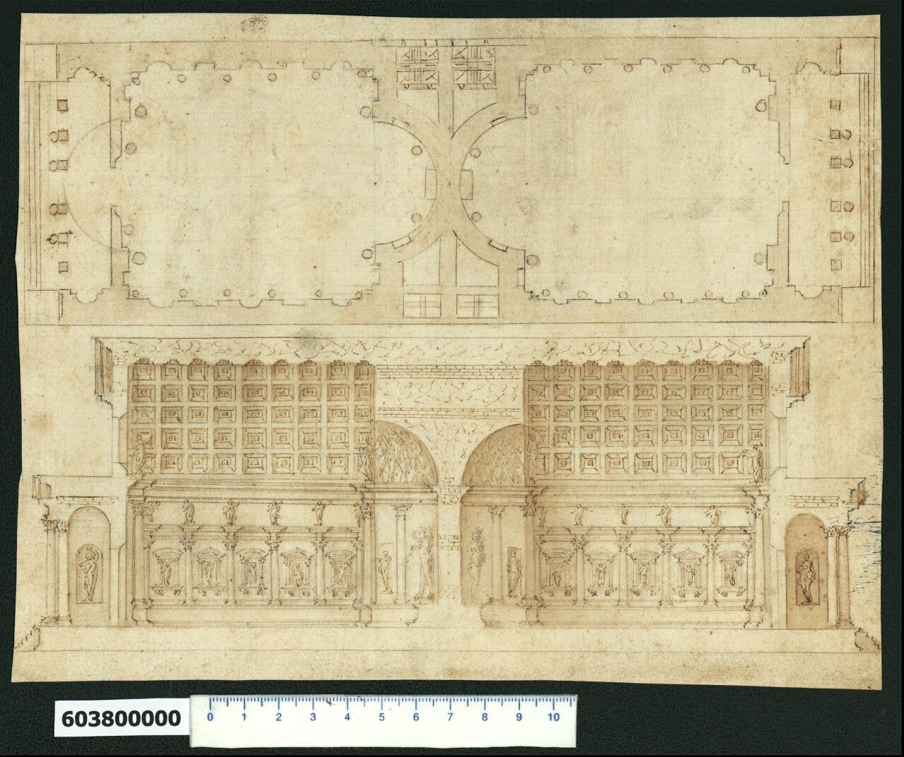 - NOTIZIE STORICO CRITICHE L'attribuzione del disegno a Giovanni Battista Montano fatta da Valeria Pracchi (1991, 2a parte, p. 19) su segnalazione di Anna Bedon, è confermata dalla Fairbairn (1998, cat. 1081, pp. 644-645). Il disegno raffigura la pianta e la sezione longitudinale del tempi di Venere e Roma, conosciuto anche come Tempio del Sole e della Luna. Il tempio, inaugurato nel 141 d.C. dal successore di Adriano, l'imperatore Antonino Pio, fu eretto sul luogo in cui sorgeva il vestibolo della Domus Aurea, di cui mantenne l'orientamento e riutilizzò in parte le fondazioni.\nLa pianta mostra due celle contrapposte, una per ciascuna divinità, con l'abside tangente, entrambe precedute da un pronao esastilo su pilastri, quattro dei quali hanno colonne addossate. La parete e scavata da nicchie rettangolari poco profonde inquadrate da colonne libere; altre quattro colonne di ordine maggiore, sono poste a sorreggere il grande arco di controfacciata e quello dell'abside. Negli spazi di risulta tra le absidi sono inserite delle scale. La sezione longitudinale restituisce un interno scandito dalle colonne su basamento continuo, che reggono una trabeazione aggettante in corrispondenza dei capitelli, che funge da piedistallo alle statue. Queste sono tangenti alla trabeazione di imposta della grande volta a botte cassettonata a lacunari e del catino a cassettoni incrociati dell'abside, ancora visibili nei resti esistenti del tempio. Negli intercolumni trovano posto le nicchie su mensole con timpani triangolari e curvilinei alternati. Una versione alternativa del tempio è delineata nel foglio conservato a Londra (Sir John Soane's Museum, in Fairbairn 1998, cat. 1081), con l'aggiunta del mezzo prospetto e mezza sezione trasversale oltre che dei dettagli dei capitelli. Le differenze del disegno londinese sono individuabili nella scelta delle colonne nel pronao in luogo dei pilastri, nella soluzione della controfacciata absidata (rettilinea nel foglio di Milano) e nell'articolazione parietale interna: per questa prevede l'alternanza di piccole nicchie con timpano triangolare, con edicole più grandi delimitate da colonne su piedistallo che reggono il timpano semicircolare. \nEntrambe le soluzioni derivano da Palladio, ("I Quattro Libri dell'Architettura", Libro Quarto, Cap. X, "Tempii del Sole e della Luna", Venezia 1581, p. 37), ma mentre quella di Milano varia solo nei pilastri con colonne del pronao (Palladio prevede solo sei colonne), la versione di Londra differisce, così come già notato nel confronto tra i due disegni, nell'articolazione interna delle pareti.\nIl disegno va messo in relazione con quello raffigurante la facciata e la sezione trasversale conservato nella Biblioteca Nazionale di Madrid (Album di Antonio Garcia Reinoso, AB 922). Il disegno non è mai stato riprodotto nelle edizioni di Soria e in quelle successive (Bedon 1982, p. 79 nn. 2-3).