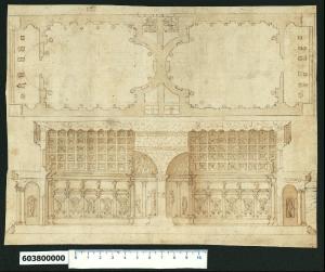 disegno che conserva tracce della preliminare costruzione a grafite è eseguito con inchiostro bruno a penna utilizzando tiralinee, compasso e mano libera nelle parti ornamentali; le ombreggiature e i dettagli sono precisati con acquerellature di inchiostro bruno; campiture di acquerello beige nello spessore delle murature; il supporto sul quale è tracciato è di carta avorio