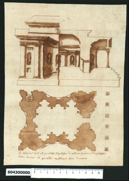 - NOTIZIE STORICO CRITICHE Nell'"Indice de due Tomi d'Intagli Tempietti ed altro", relativo ai tomi V e VI e compilato dal collezionista Giacomo Sardini, il disegno viene iscritto nel paragrafo "Mausolei sepolcrali" con la definizione "132 con Tempio".\nL'attribuzione del disegno a Giovanni Battista Montano fatta da Valeria Pracchi (1991, 2a parte, p. 19) su segnalazione di Anna Bedon, la quale identifica come non autografa l'iscrizione presente sul foglio (Bedon 1982, p. 82, n. 1), è confermata dalla Fairbairn (1998, cat. 1069, pp. 640-641).\nIl disegno raffigura una tomba romana non identificata situata a Marino la cui cella rettangolare, con il perimetro esterno è scavato da quattro grandi esedre con nicchie, è anticipata da un pronao esastilo di colonne ioniche; nello spessore dell'angolo in alto a sinistra è ricavata una scala a chiocciola. Le pareti interne longitudinali sono scavate da due cappelle con tre nicchie, mentre al centro di ogni parete è inserita una nicchia semicircolare inquadrata da colonne libere. Queste, come mostra la sezione, reggono un timpano triangolare il cui vertice è tangente al cornicione di imposta della copertura a botte. All'esterno sotto le nicchie è presente uno sfondato quadrato, mentre quelle inserite ai lati delle esedre sono inquadrate da lesene ioniche. Sopra la trabeazione è inserito un volume con finestra al centro. Il disegno è riprodotto in modo identico - compresa l'iscrizione alla base (la cui grafia però è diversa), ma con una stesura dell'acquerello più leggera che rende ben leggibili i particolari - nell'album conservato a Parigi (Bibliothèque Nationale de France, "Recueil de dessins d'architecture par Giovanni Battista Montano", ms Hb, 22-4, f. 28r). La composizione di questi due disegni è stata poi pubblicata nell'opera di Montano del 1624 (Libro primo Scielta d. varii tempietti antichi con le piante et alzatte desegnati in prospettiva, tav. 64), e nella successiva edizione del 1684 di De Rossi con la didascalia "Tempio antico" ("Libro Secondo. Scielta D Varii Tempietti Antichi", p. 43). L' "invenzione" di Montano è stata criticata da Zander (1962, pp. 21-22) per la presenza dell'attico che si impone con la sua massa in modo artificioso sul ben concepito perimetro di base, e per il fatto che le due colonne centrali del portico nascondo la concavità dell'esedra. Questa "anomalia" è assente nel disegno conservato a Londra (Sir John Soane's Museum, in Fairbairn 1998, cat. 1069): le colonne del pronao, infatti, sono solo quattro e poste ai lati dell'esedra. Altre differenze con i fogli di Milano e Parigi si riscontrano nell'articolazione interna della parete, dove mancano le quattro cappelle laterali e le colonne ai lati delle nicchie. Il modello di riferimento, secondo Zander (1962, p. 22) sarebbe un disegno di Sallustio Peruzzi per un sepolcro "a Marino", che sebbene di pianta quadrata, è molto simile a quello milanese.\nPiù recentemente Arnalda Dallaj (2017) ha attribuito a Claude Perret questo foglio, considerato una derivazione da disegno di Montano.
