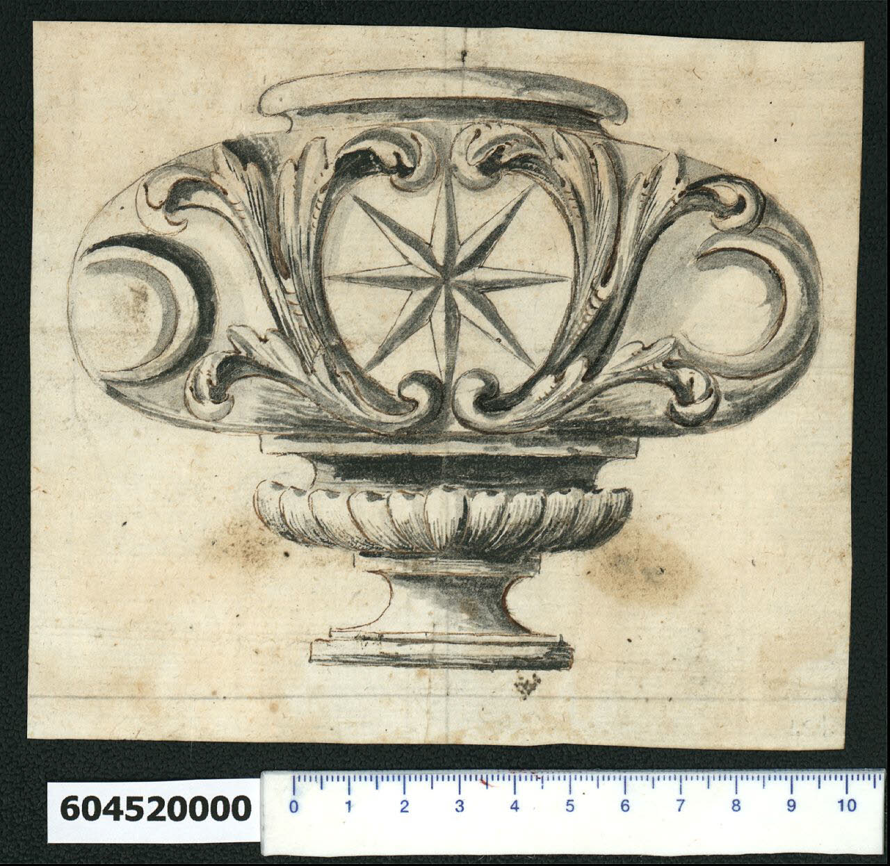 - NOTIZIE STORICO CRITICHE Nell'"Indice de due Tomi d'Intagli Tempietti ed altro", relativo ai tomi V e VI e compilato dal collezionista Giacomo Sardini, il disegno viene iscritto nel paragrafo "Vasi" con la definizione "133 con stella".\nSul foglio in esame è rappresentato un vaso il cui corpo centrale, sostenuto da una doppia base sagomata di cui la seconda lavorata in forma di corolla (baccellatura), ha una forma ovalizzata con asse maggiore orizzontale ed è decorata in rilievo da una stella centrale ad otto punte circondata da un motivo a foglie d'acanto. Alle estremità sono due forme rilevate a "C", entrambe con le punte rivolte a sinistra. L'imboccatura del vaso ha il bordo arrotondato. Il disegno è attribuito in forma dubitativa a Giovanni Battista Montano da V. Pracchi su segnalazione di A. Bedon (Pracchi, 1991 p. 19).\nPoiché spesso le suppellettili del periodo, se realizzate per personaggi di famiglie nobili, ne riportavano gli emblemi, si potrebbero condurre ipotesi in tal senso. \nIl motivo della stella a otto punte è presente negli emblemi di Sisto V (pontificato 1585-1590) appartenente alla famiglia Peretti-Montalto e Clemente VIII (pontificato1592-1605) discendente della famiglia Aldobrandini, pontefici del periodo in cui fu attivo Montano. Anche le caratteristiche stilistiche potrebbero confermare l'attribuzione.