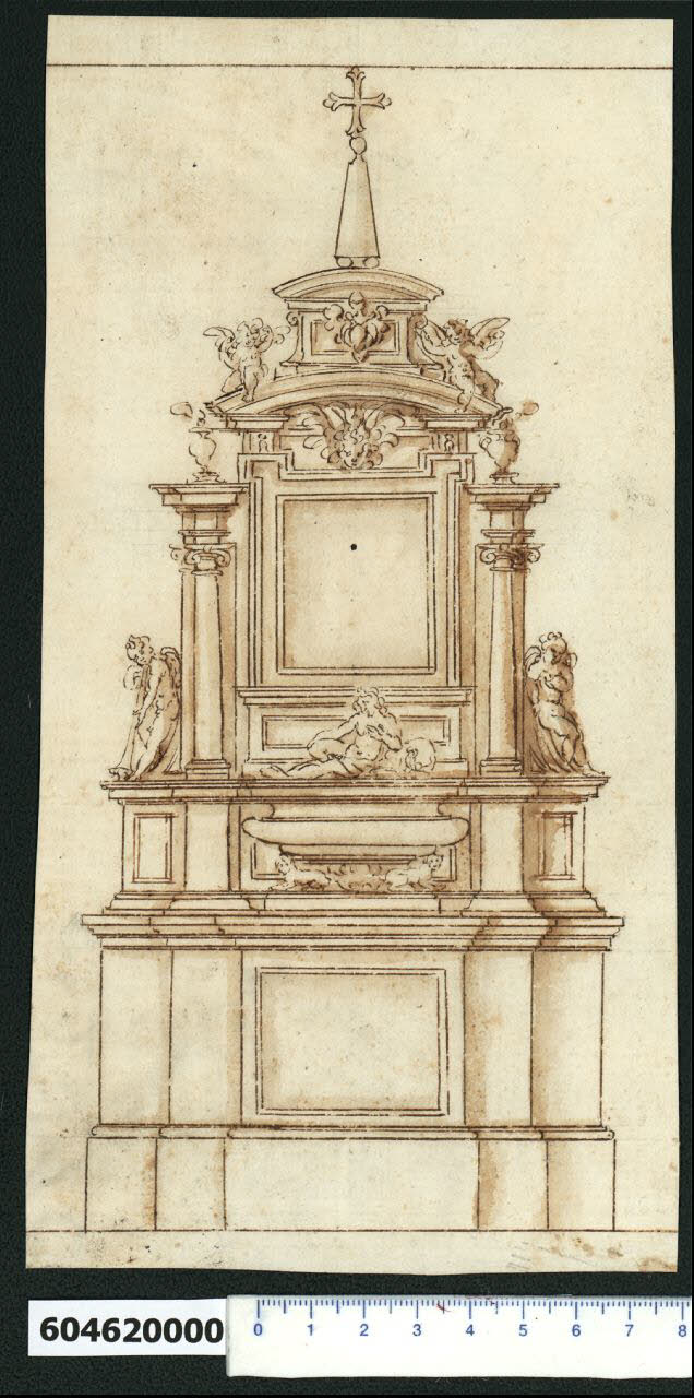 - NOTIZIE STORICO CRITICHE Nell'"Indice de due Tomi d'Intagli Tempietti ed altro", relativo ai tomi V e VI e compilato dal collezionista Giacomo Sardini, il disegno viene iscritto, insieme ad altro foglio già incollato sul lato opposto del medesimo supporto di legatura, nel paragrafo "Mausolei sepolcrali" con la definizione "134 composito ed altro più piccolo".\nQuesto disegno, attribuito a Giovanni Battista Montano da V. Pracchi (che lo definisce "Altare") su segnalazione di A. Bedon (Pracchi, 1991 p. 19) e da L. Fairbairn (Fairbairn, 1998 vol. II, Appendix 8, p. 771), si presenta su un foglio evidentemente ritagliato in maniera irregolare che probabilmente presentava una marginatura semplice, oggi limitata alle linee superiore e inferiore.\nLa grafia è poco curata e denotante una esecuzione veloce. Questo induce a pensare che potrebbe trattarsi di un disegno di ideazione eseguito da Montano stesso.\nIl monumento funebre qui raffigurato presenta una composizione simmetrica rispetto alla mezzeria ed è impostato su un alto basamento con zoccolatura, articolato in modo da avanzare nella parte centrale, decorata con una riquadratura, su cui poggia il sepolcro a base sagomata sorretto da felini accovacciati. Sul piano superiore del sepolcro si trova una figura semidistesa appoggiata a un cuscino che rappresenta il defunto.\nLa cornice soprastante destinata a una raffigurazione o un'iscrizione, è compresa tra due colonne ioniche che si stagliano dalla struttura di fondo e sorreggono un'urna fumante tramite un piedritto e una cornice sporgente. Ai lati della struttura di fondo, dove è riproposto il motivo del capitello ionico, sono appoggiati due angeli, di cui quello a sinistra reca il motivo ricorrente della fiaccola rovesciata (sul significato, cfr. Milano, Collezione Sardini Martinelli inv. 6,30).\nLa medesima cornice ha gli spigoli superiori rialzati, che sorreggono un frontone curvilineo interrotto alla base dalla testa di un cherubino e ai cui estremi sono seduti due angioletti. L'estradosso del frontone sorregge la parte terminale del monumento, costituita da un elemento rettangolare con al centro un vessillo araldico (con elmo), chiuso da un frontone curvilineo che sorregge un elemento in foggia di obelisco sovrastato da una croce.\nUn disegno con lo stesso soggetto e quasi perfettamente riprodotto, si trova all'interno del Codice di Parigi, album lasciato in eredità da Henri de Cambout, Duca di Coislin al Monastero di Saint Germain des Prés nel 1732, oggi conservato presso la Bibliothèque National de France a Parigi e segnalato da Lynda Fairbairn (Italian Renaissance Drawings from the Collection of Sir John Soane's Museum, London, 1998 pp. 770-771) (MS Hb, 22 - 4, f. 90r consultato nel microfilm F9396).