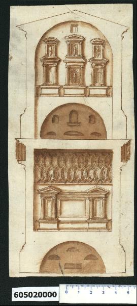 - NOTIZIE STORICO CRITICHE Il foglio 50b, già impaginato sul supporto con n. antico 136, non è citato nell'indice di Giacomo Sardini.\nA partire dal Rinascimento, il proposito di disegnare e interpretare i resti dell'architettura antica e in particolare quella di Roma e dei suoi dintorni e il collezionismo di disegni architettonici divenne presto una pratica comune tra gli stessi architetti. I disegni, in originale o in copia, erano conservati in genere con il proposito di illustrazione in libri stampati, come risorsa per studi accademici, per creare repertori utili al proprio lavoro o per preservare il lavoro di riproduzione del proprio maestro. \nLe fonti dei disegni potevano essere la visione diretta, ma anche la copia da disegni e ricostruzioni precedenti o descrizioni tratte da fonti letterarie e perfino incisioni su monete. I disegni, riprodotti a volte in più copie, venivano redatti anche per la vendita.\nQuesto disegno è attribuito a Giovanni Battista Montano da V. Pracchi su segnalazione di A. Bedon (Pracchi, 1991 p. 19), cui rimanda L. Fairbairn (Fairbairn, 1998 vol. II, n. 1217 p. 692 e Appendix 8, p. 771).\nLa tomba romana, rappresentata nelle due sezioni trasversale e longitudinale sovrapposte, non è identificata, ma doveva sorgere nella campagna romana lungo la via Appia, secondo l'indicazione fornita su verso di un foglio su cui è riprodotto lo stesso edificio da un anonimo disegnatore francese del XVI secolo e conservato ad Amsterdam. Secondo L. Fairbairn, si tratta di un edificio tipico del III secolo, di forma quadrata, che poggia su un alto basamento e ha al suo interno un ambiente voltato incluso nello stesso, dove si aprono nicchie tombali di forma diversificata (rettangolare, a lunetta e ad arco), sovrastato da una stanza coperta da un soffitto a botte cassettonato a losanghe decorate. \nNella sezione trasversale sulla parete di fondo della stanza superiore compaiono tre nicchie racchiuse tra colonne poggianti su un basamento (forse un altare). Di queste le due laterali sono concluse da un frontone triangolare interrotto che trattiene le nicchie superiori con statue, sormontate da frontoni curvilinei, mentre quella centrale, la cui rientranza arcuata è occupata da una statua, è conclusa da una trabeazione che porta una ulteriore nicchia con statua tra colonne ma sormontata da un frontone triangolare. Sopra di esso si apre una piccola finestra strombata.\nLa sezione longitudinale mostra invece sulla parete sotto il soffitto cassettonato due tabernacoli con frontoni triangolari uniti da una riquadratura con pannello rettangolare incassato. \nIl disegno si trova anche nel Codice di Parigi (MS Hb, 22 - 4, f. 75 consultato nel microfilm F 9377) e nell'album di Montano Soane's Museum di Londra (Fairbairn, 1998 vol. II, p. 693 n. 1217) dove presenta statue in tutte le edicole, anche sul lato della sezione longitudinale.