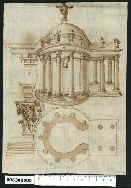 - NOTIZIE STORICO CRITICHE Nell'"Indice de due Tomi d'Intagli Tempietti ed altro", relativo ai tomi V e VI e compilato dal collezionista Giacomo Sardini, il disegno viene iscritto nel paragrafo "Tempietti" con la definizione "142 rotondo con portico".\nL'attribuzione del disegno a Giovanni Battista Montano fatta da Valeria Pracchi (1991, 2a parte, p. 19) su segnalazione di Anna Bedon, è confermata dalla Fairbairn (1998, cat. 1124, pp. 660-661). Il disegno raffigura pianta, prospettiva e dettagli dell'ordine della ricostruzione del tempio di Marte in Campidoglio. Il tempio pseudoperiptero è preceduto da un profondo pronao su quattro colonne. Le colonne sorreggono una trabeazione con statue che schermano in parte il basso tamburo sul quale è impostata la cupola. Il dettaglio dell'ordine mostra un capitello ornato al centro da un trofeo militare, che secondo la Fairbairn (1998, p. 660) assomiglia a quello del Porticus Deorum Consentium ai piedi del Campidoglio e che probabilmente Montano aveva associato al tempio. La studiosa ritiene inoltre che la ricostruzione montaniana sia basata sul sesterzio e sul denaro di Augusto, che mostrano un tempio circolare con colonne attorno alla cella e un carro all'interno di questa, simile a quello raffigurato nel disegno conservato a Chatsworth (Devonshire Collection, Album 36, fol. 22). Zander (1962, p. 24-25) riconosce nella soluzione planimetria analoga nella pianta del tempio B dell'area sacra di Largo Argentina che però Montano non poteva conoscere, ma che, stando a quanto afferma la Fairbairn (op. cit.), poteva aver visto nella "Forma Urbis", la pianta marmorea di Roma della Collezione Farnese.\nIl disegno compare anche nelle collezioni di Londra (Sir John Soane's Museum, in Fairbairn 1998, cat. 1124), con impostazione sostanzialmente simile a parte l'inserimento del fregio a girali nel dettaglio della trabeazione, e in quella già citata di Chatsworth. In quest'ultimo esemplare però, la pianta restituisce un tempio periptero con la muratura interna della cella scavata da nicchie; la prospettiva è parzialmente sezionata, e mostra un interno sobrio, ornato dalla sola cornice di imposta del tamburo, e occupato da un carro.\nUna replica identica del disegno londinese è presente nelle tavole pubblicate da Ferrante nel 1636 ("Raccolta de' templi et sepolcri disegnati dall'antico da Gio. Battista Montano ...") e da De Rossi nel 1684 con la didascalia "Questo tempio dicono essere stato in Campidoglio quando li Galli, scoperti dal stridor delle Oche volevano per tradimento pigliare la Rocca di esso, per la poca guardia delle Sentinelle, una delle quali per castigo fu gettata dalla sumità di essa Rocca" ("Raccolta de templi, e sepolcri disegnati dall'antico da Gio. Battista Montano Milanese. Libro Terzo", tav. X).