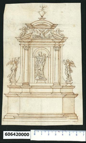- NOTIZIE STORICO CRITICHE Nell'"Indice de due Tomi d'Intagli Tempietti ed altro", relativo ai tomi V e VI e compilato dal collezionista Giacomo Sardini, il disegno viene iscritto nel paragrafo "altari diversi" con la definizione "143 a due colonne".\nL'attribuzione del disegno a Giovanni Battista Montano fatta da Valeria Pracchi (1991, 2a parte, p. 19) su segnalazione di Anna Bedon, è confermata dalla Fairbairn (1998, p. 770).\nIl disegno raffigura il prospetto di un altare impostato su un basamento di altezza pari a quella della mensa. Un'ulteriore fascia liscia funge da piedistallo per le colonne corinzie che inquadrano la nicchia con statua della Madonna. Sopra la trabeazione, che aggetta in corrispondenza delle colonne, è inserito un timpano triangolare, spezzato al centro per l'inserimento di pannello decorato da una sirena bicaudata. Il coronamento sommitale è costituito da un timpano curvilineo e da un vaso fiammeggiante. Ai lati delle colonne due pseudo volute si raccordano con i piedistalli sormontati da angeli.\nIl disegno è replicato nell'album conservato a Parigi (Bibliothèque Nationale de France, "Recueil de dessins d'architecture par Giovanni Battista Montano", ms Hb, 22-4, f. 83v). Tra i due elaborati si riscontrano alcune lievi differenze: in quello milanese il tratto è più lineare e sono presenti le linee di costruzione a grafite, mentre sono del tutto assenti nell'esemplare parigino. Quest'ultimo mostra invece alcuni dettagli decorativi diversi o mancanti in quello della Collezione Sardini Martinelli: i capitelli delle colonne sono ionici (e vengono previsti anche per le pseudo lese laterali); in chiave di volta della nicchia è inserita una mensola e, infine, la postura del cherubino in alto a sinistra è differente. Come ultima nota va segnalata nel disegno di Parigi un'ombreggiatura più marcata.