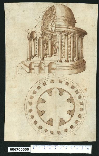 - NOTIZIE STORICO CRITICHE Nell'"Indice de due Tomi d'Intagli Tempietti ed altro", relativo ai tomi V e VI e compilato dal collezionista Giacomo Sardini, il disegno viene iscritto nel paragrafo "Tempietti" con la definizione "144 rotondo con portico circolare".\nIl disegno è attribuito a Giovanni Battista Montano da Lynda Fairbairn (1998, p. 652, cat. 1109), mentre Valeria Pracchi (1991, 2a parte, p. 19) su segnalazione di Anna Bedon, è dubitativa sulla paternità montaniana, senza fornire ulteriori indicazioni in merito. \nIl disegno mostra la pianta e la prospettiva, in parte sezionata, della ricostruzione del tempio di Portumno a Porto, città portuale nei pressi di Ostia. L'edificio periptero, posto su un basamento di tre gradini, mostra 24 colonne corinzie che reggono una trabeazione della copertura a volta del portico. All'interno la cella è scandita da profonde nicchie circolari e rettangolari, inquadrate da colonne corinzie in corrispondenza della quali la trabeazione superiore è aggettante. Sulla cornice sono poste delle statue e la cupola presenta un intradosso a cassettoni e un oculo centrale sul modello del Pantheon. A Londra (Sir John Soane's Museum, in Fairbairn 1998, cat. 1109) si conserva un disegno analogo le cui varianti consistono in un portico di 18 colonne posto su un podio di 5 gradini e nella decorazione della cupola che si presenta costolonata con pannelli ovali negli spicchi.\nSecondo la Fairbairn (1998, p. 652) il riferimento di Montano per questi due disegni, sarebbe la ricostruzione del tempo fatta da Giuliano da Sangallo, che però è priva del portico circolare e le colonne interne reggono le nervature della cupola decorata con grandi pannelli ovali. Il tempio è stato studiato e disegnato da molti artisti del Rinascimento (cfr. Fairbairn, cit., Appendix 5, p. 746) e descritto da Pirro Ligorio nel suo manoscritto sulle antichità di Roma: "Portus, o vero Portum, è porto e città de' Latini discosto a Roma e due miglia da Ostia città [...]. Et a destra dell'entrata de la Porta Romana era il tempio circolare di Portumno e della Fortuna Tranquilla, e quivi cavandosi da monsignor Bellaio vescovo portuense furono trovate queste dedicazioni, le quali erano attorno ad uno certo[c. 75v] circuito che faceva una privata circuizione attorno al tempio, lo quale era un bellissimo peryptero con colonne del quale tempio avemo fatto il particolare disegno [...]" (P. Ligorio, "Antichità di Roma", Torino, Archivio di Stato, ms. a.II.1 vol.14, cc. 75r-v; http://lartte.sns.it/ligorio/ligorio.php). L'associazione del disegno di Montano a questo soggetto era stata avanzata già da Ashby (Fairbairn 1998, p. 652, cat. 1109).