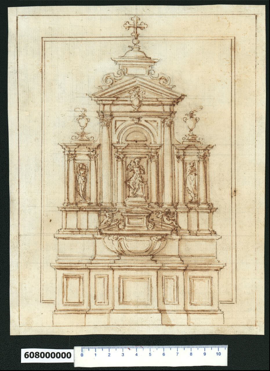 - NOTIZIE STORICO CRITICHE Nell'"Indice de due Tomi d'Intagli Tempietti ed altro", relativo ai tomi V e VI e compilato dal collezionista Giacomo Sardini, il disegno viene iscritto, insieme ad altro foglio già incollato sul lato opposto del medesimo supporto di legatura, nel paragrafo "Mausolei sepolcrali" con la definizione "151 152 magnifico ed altro piccolo".\nIl disegno, che rappresenta un monumento funebre a parete simmetrico secondo la mezzeria, è\nattribuito a Giovanni Battista Montano da V. Pracchi su segnalazione di A. Bedon (Pracchi, 1991 p. 19) e da L. Fairbairn (Fairbairn, 1998 vol. II, Appendix 8, p. 771).\nEsso appare incorniciato come altri di analogo soggetto (Milano, Collezione Sardini Martinelli invv. 6,30; 6,36; 6,49; 6,60; 6,69; 6,79; 6,88; 6,93) da una doppia marginatura, di cui quella interna, a doppia linea, è tagliata in alto dall'elemento decorativo terminale (una croce trilobata) e in basso dalla zoccolatura del basamento, che sembra poggiare sulla linea inferiore della marginatura esterna.\nAnche alcuni disegni di cornici (Ibidem, invv. 6,76 e 6,87a) presentano la stessa doppia marginatura.\nI tratti veloci e approssimativi delle figure inducono a confermare l'attribuzione del disegno allo stesso Montano.\nLa composizione architettonica e decorativa è anche in questo caso impostata su un robusto basamento con riquadrature e zoccolatura a pavimento, articolato su piani verticali avanzanti per raccordarsi all'elemento centrale più sporgente su cui è adagiato il sepolcro. Quest'ultimo ha una base dalle linee arrotondate e decorata con due testine di cherubino che sembrano reggere la chiusura superiore: un frontone triangolare su cui siedono due angioletti e interrotto al centro da un elemento rettangolare riquadrato sostenuto da volute e sormontato da un frontone curvilineo. \nIl basamento sottostante si sviluppa su altri due livelli oltre la spessa e sagomata cornice superiore, che fanno da sfondo al sepolcro stesso e di cui il secondo accoglie le basi di supporto degli elementi architettonici soprastanti, che seguono uno schema compositivo tripartito. Al centro, sopra l'elemento conclusivo del sepolcro, si staglia sullo sfondo di una riquadratura una figura femminile drappeggiata con in mano uno scettro e seduta su un alto piedistallo. La figura è affiancata da due colonne (o semicolonne) corinzie che sostengono un arco inscritto in una riquadratura emergente dalla parete di fondo e con al centro una lunetta. Questa composizione è a sua volta racchiusa tra due colonne (o semicolonne) corinzie di proporzioni doppie rispetto alle precedenti, che sostengono tramite una trabeazione un frontone triangolare spezzato alla base, con al centro un'arme gentilizia. Sopra il frontone si erge l'elemento conclusivo costituito da una riquadratura sagomata per iscrizione sorretta da volute appoggiate su piedistalli, sopra la quale oltre una cornice aggettante è posta una cupoletta sagomata con croce trilobata su sfera.\nAi lati dell'imponente elemento centrale sopra descritto, si raccordano altri due elementi composti da coppie di colonne (o semicolonne) con basi separate, inframmezzate da statue di figure femminili drappeggiate che si stagliano su una riquadratura della parete di fondo. Sopra le colonne, che hanno le proporzioni di quelle centrali minori, oltre la trabeazione spezzata con cornice aggettante, sono poste due urne fumanti su piedistallo sagomato.