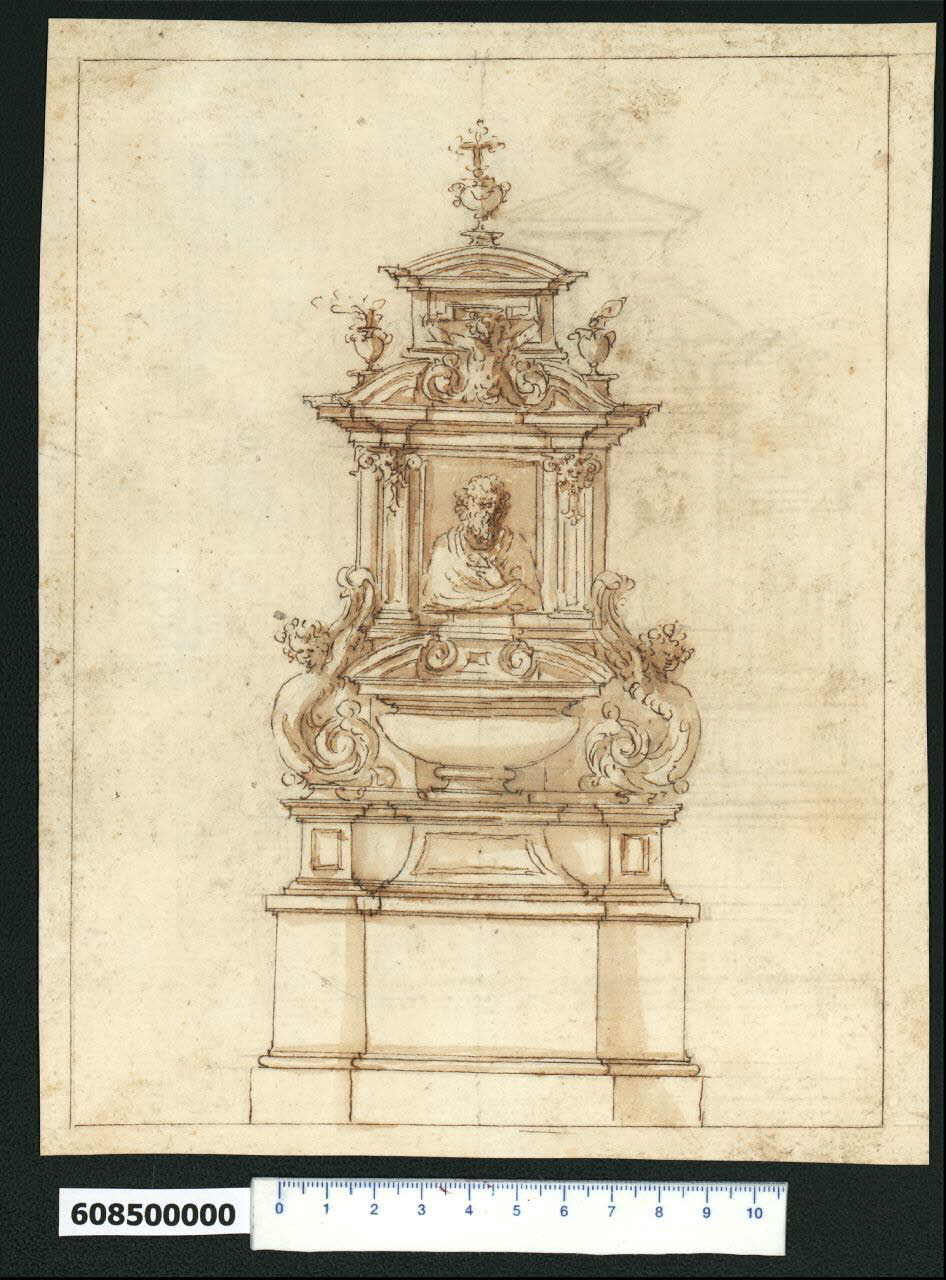 - NOTIZIE STORICO CRITICHE Nell'"Indice de due Tomi d'Intagli Tempietti ed altro", relativo ai tomi V e VI e compilato dal collezionista Giacomo Sardini, il disegno viene iscritto, insieme ad altro foglio già incollato sul lato opposto del medesimo supporto di legatura, nel paragrafo "Mausolei sepolcrali" con la definizione "153 a 4 colonne e senza colonne".\nIl monumento funebre raffigurato sul foglio presenta una composizione simmetrica rispetto alla mezzeria, con un alto basamento su zoccolatura a pavimento, la cui parte centrale avanzata sostiene su un doppio piedistallo sagomato un sepolcro dalla base arrotondata. Il coperchio è costituito da una sorta di frontone a volute contrapposte che si fronteggiano al centro inframmezzate da un piedistallo sagomato.\nIl sepolcro è affiancato da due angeli in forma di volute vegetali, appoggiati tramite piedistalli sui piedritti riquadrati sottostanti e dominato dalla composizione decorativa del monumento.\nQuest'ultima si eleva dal basamento ed è costituita da un elemento quadrangolare con al centro una campitura di sfondo al busto di una figura maschile anziana e barbuta, avvolta da un sudario.\nLa campitura è affiancata da due lesene riquadrate con due maschere e pendente alla sommità, per sostenere la cornice aggettante spezzata di un frontone curvilineo, interrotto al centro da un mezzo angelo su volute vegetali. Ai lati del frontone sono poste due urne fumanti, mentre la parte conclusiva della composizione è costituita da un elemento rettangolare, con una cornice sagomata sorretta con le mani dall'angelo sopra descritto e sormontata da un frontone curvilineo, su cui è posta un'urna con croce su piedistallo.\nIl disegno, attribuito a Giovanni Battista Montano da V. Pracchi su segnalazione di A. Bedon (Pracchi, 1991 p. 20) e da L. Fairbairn (Fairbairn, 1998 vol. II, Appendix 8, p. 771), è incorniciato da una marginatura semplice.\nI tratti veloci e approssimativi inducono a confermare l'attribuzione del disegno allo stesso Montano.