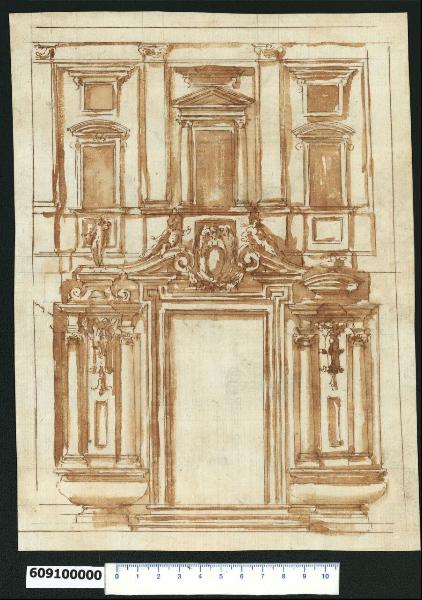 - NOTIZIE STORICO CRITICHE Nell'"Indice de due Tomi d'Intagli Tempietti ed altro", relativo ai tomi V e VI e compilato dal collezionista Giacomo Sardini, il disegno viene iscritto, insieme ad altro foglio non contiguo, nel paragrafo "Case loro parti" con la definizione "107 Facciata e 156".\nIl disegno, che sembra attribuibile per analogia stilistica a Giovanni Battista Montano come afferma V. Pracchi su segnalazione di A. Bedon (Pracchi, 1991 p. 20) e indica L. Fairbairn (Fairbairn, 1998 vol. II, Appendix 8, p. 770), è la rappresentazione parziale di una facciata, ma non è possibile stabilire con certezza se di un palazzo o di una chiesa, se di un esterno o un interno. La composizione presenta un portale contornato da una cornice sagomata dagli angoli superiori estroflessi che sostengono un frontone a volute contrapposte allacciate da una ghirlanda, interrotto da una cartella gentilizia posta sullo sfondo di una riquadratura e affiancata da due angioletti distesi sulle volute. A lato del portale, rialzato di tre gradini, sono proposte due soluzioni architettoniche che presentano le medesime coppie di colonne ioniche incassate, appoggiate su un basamento, che sostengono una trabeazione con cornice aggettante interrotta e che sono divise tra loro da una fascia muraria, ma che differiscono sia per il motivo del pendente decorativo presente sulla fascia, sia per gli elementi che sovrastano la cornice: un piedistallo con appoggio a volute per una statua a sinistra e un frontone curvilineo su piedistallo con urna fumante superiore, sulla destra. Alla base delle colonne su entrambe i lati si trovano due elementi a base curvilinea su appoggio, che potrebbero rappresentare delle vasche o dei sepolcri. La parte superiore della facciata è ripartita in tre campiture da paraste ioniche. Nella parte centrale, sopra il portone, si trova una finestra a edicola con colonnine laterali e frontone triangolare, sovrastato da un tratto di cornice. Nelle campiture laterali le finestre sono più piccole e sovrastate da un frontone curvilineo. Sopra di esse un'ulteriore apertura rettangolare contornata e completata da un tratto di cornice sporgente simile a quella centrale.
