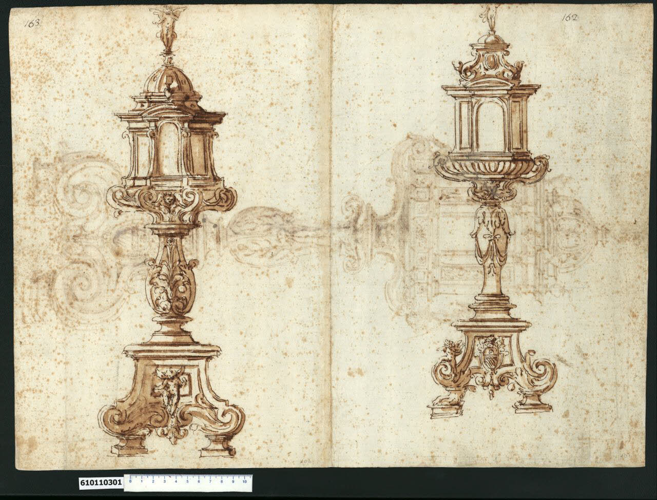 - NOTIZIE STORICO CRITICHE Nell'"Indice de due Tomi d'Intagli Tempietti ed altro", relativo ai tomi V e VI e compilato dal collezionista Giacomo Sardini, il disegno viene iscritto, insieme ad altri, nel paragrafo "Reliquario" alla numerazione "164" e "163.164".\nIl foglio in esame presenta due versioni di un reliquiario, prodotto in una terza versione sul verso, analizzata a parte (Milano, Collezione Sardini Martinelli inv. 6,101 V). \nI disegni sono attribuiti a Giovanni Battista Montano da V. Pracchi su segnalazione di A. Bedon (Pracchi, 1991 p. 20), da L. Fairbairn (Fairbairn, 1998 vol. II, Appendix 8, p. 771) e da L. Marcucci (Marcucci, 2008 p. 73).\nI due oggetti potrebbero far parte di una serie di suppellettili sacre progettate da Montano. Alcuni elementi decorativi sono comuni a quelli di una serie di disegni sono raccolti nella Collezione di Madrid (Biblioteca Nacional) tra cui ostensori (?) (AB 891; AB 895; AB 930 V) e un candeliere (AB 906).\nNel reliquiario raffigurato sulla sinistra del foglio il piedistallo sagomato è rialzato su due appoggi in corrispondenza delle due volute contrapposte alla base che si incontrano in un pendente vegetale centrale, dal quale si eleva la figura di un putto alato. Sopra questa prima parte si erge il fusto decorato con un motivo floreale tra due foglie d'acanto, che regge, attraverso delle volute tra cui sono posti alternativamente teste di cherubino e drappi, la teca presumibilmente di forma esagonale. \nLe parti vetrate di quest'ultima sono alternativamente rettangolari e arcuate, sormontate le prime da una cornice retta, le seconde da un frontone curvilineo spezzato alla base su cui poggia un'urna. L'elemento conclusivo dell'oggetto liturgico è una cupoletta costolonata su cui si erge un angioletto su piedistallo.\nIl secondo reliquiario raffigurato sulla parte destra del foglio presenta un piedistallo sagomato simile al precedente, ma con un'arme gentilizia riferibile alla famiglia Orsini sopra il pendente centrale al posto del putto alato, che invece è seduto sulla voluta di sinistra, posta su un appoggio con zampa (forse di orso). Questa soluzione costituisce una variante rispetto alla proposta di voluta vegetale su semplice appoggio visibile a destra. Il fusto è decorato da drappi appesi a foglie d'acanto rovesciate verso il basso, alla cui base si innestano le volute, inframmezzate da una testina di cherubino, che reggono la teca. Quest'ultima, simile alla precedente ma priva delle mensole a voluta tra le parti vetrate, ha una base a corolla e una parte terminale costituita da volute vegetali sormontate da una testa di cherubino e inframmezzate da una cartella ovale, concluse superiormente da una cupoletta su cui si erge un angioletto su piedistallo.\nLo stemma degli Orsini è riproposto nel disegno tracciato sul verso del foglio (Ibidem, inv. 6,101 V) e all'interno del frontone conclusivo della facciata di una chiesa (Ibidem, inv. 6,70).\nIl reliquiario potrebbe essere stato progettato da Montano per Alessandro Orsini (1593-1626), nominato cardinale nel 1615 da Papa Paolo V e legato pontificio, appartenente al ramo della famiglia di Bracciano.