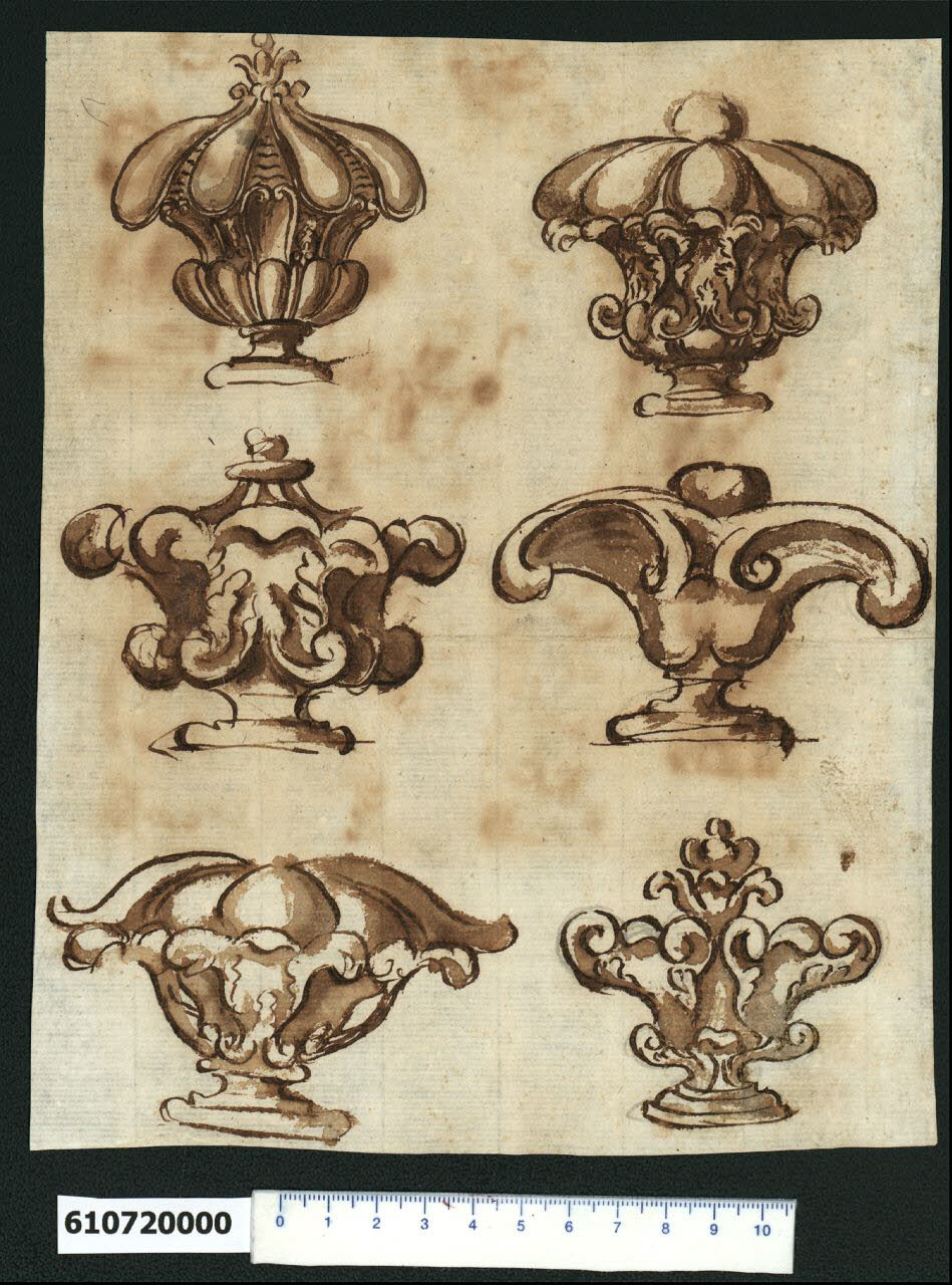 - NOTIZIE STORICO CRITICHE Nell'"Indice de due Tomi d'Intagli Tempietti ed altro", relativo ai tomi V e VI e compilato dal collezionista Giacomo Sardini, il disegno viene iscritto nel paragrafo "Vasi" con le definizioni "altri vasi 167" e "167 sei vasi".\nIl foglio in esame riporta una serie di studi indicati da Sardini come vasi, ma che potrebbero anche costituire un repertorio di modelli di puntali o pomoli per arredi. I motivi decorativi richiamano forme vegetali, di corolle e foglie stilizzate. Il disegno è attribuito a Montano da V. Pracchi su segnalazione di A. Bedon (Pracchi, 1991 p. 20) e indicato da L. Fairbairn (Fairbairn, 1998 vol. II, Appendix 8, p. 771).