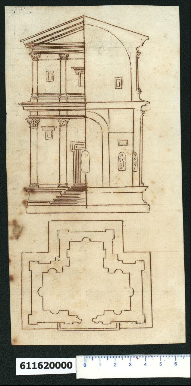 - NOTIZIE STORICO CRITICHE Nell'"Indice de due Tomi d'Intagli Tempietti ed altro", relativo ai tomi V e VI e compilato dal collezionista Giacomo Sardini, il disegno viene iscritto nel paragrafo "Tempietti" con la definizione "171 a 3 cappelle".\nL'attribuzione del disegno a Giovanni Battista Montano fatta da Valeria Pracchi (1991, 2a parte, p. 23) su segnalazione di Anna Bedon (che però nel suo saggio del 1982, negava la paternità montaniana), è confermata dalla Fairbairn (1998, cat. 1043, pp. 630-631). \nIl disegno raffigura pianta, mezzo prospetto e mezza sezione della ricostruzione del sacello Bracciolini presso Porta del Popolo. La pianta ha una forma a T con la parete interna articolata con nicchie rettangolari e semicircolari, mentre all'esterno gli angoli sono rimarcati da lesene corinzie o composite. L'alzato si sviluppa su due ordini: in quello inferiore è posto al centro un portale architravato dal profilo fortemente modanato, al quale si accede tramite una scalinata, e ai lati piccole finestre. L'ordine superiore mostra in ogni campata una finestra rettangolare, quella centrale con cornice superiore retta da mensole. Un frontone triangolare conclude la composizione. La sezione mostra un interno sobrio, con le nicchie sormontate da pannelli rettangolari, e la copertura a botte.\nIl disegno è replicato in modo identico, con l'aggiunta dell'acquerellatura per la definizione delle ombre e degli sfondati delle aperture, nell'album di Parigi (Bibliothèque Nationale de France, "Recueil de dessins d'architecture par Giovanni Battista Montano", ms Hb, 22-4, f. 4r). Altro esemplare è quello conservato a Londra (Sir John Soanes Museum, cat. 1043), nel quale la pianta non presenta il perimetro del podio sul quale è appoggiata, l'ordine inferiore è ionico, sopra il portale è collocato un pannello rettangolare e la sezione non rileva la copertura a botte del braccio a destra. Il disegno londinese reca sul verso una scritta autografa di Montano: "Apresso alle Mura di roma veceno alla porta del popolo dove ando a stare il leterato e la guasto" (Fairbairn 1998, p. 630, cat. 1043). Il "letterato" viene identificato dalla Bedon (1982, p. 82, n. 12) con Giovan Leonardo Geruso, palafreniere di Ferdinando de' Medici, così chiamato perché nel 1582 cominciò a raccogliere i bambini abbandonati in un ospizio presso Porta del Popolo, vicino alla chiesa della Madonna dei Miracoli. Per la studiosa le fonti di Montano sono la pianta di Sallustio Peruzzi gli Uffizi (A 665v) e il disegno di Antonio da Sangallo il Giovane sempre agli Uffizi (A 1168v). Secondo la Fairbairn (cit., p. 630) la ricostruzione di Montano dipende da due disegni, uno attribuito a Francesco di Giorgio, l'unico a mostrare anche l'interno della tomba (Codice Destailleur B dell'Ermitage, c. 108v); l'altro conservato all'Albertina di Vienna (disegnatore anonimo G).