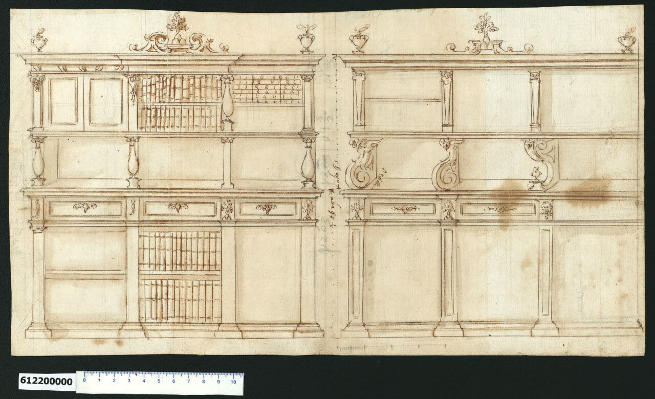 - NOTIZIE STORICO CRITICHE Nell'"Indice de due Tomi d'Intagli Tempietti ed altro", relativo ai tomi V e VI e compilato dal collezionista Giacomo Sardini, il disegno viene iscritto nel paragrafo "Banchi" con la definizione "174 ... scansia".\nIl disegno è attribuito a Giovanni Battista Montano da Valeria Pracchi (1991, 2a parte) su segnalazione di Anna Bedon e raffigura due soluzioni alternative per una credenza e potrebbe essere assimilato a quello milanese, inv. 6,97 (Collezione Sardini Martinelli).\nEntrambe le soluzioni sono impostate su tre campate per tre registri. Quella a sinistra prevede nel registro inferiore tre vani aperti, di cui due con mensola, e tre cassetti separati da elementi decorati con fiori e un emblema con tre monti e albero. Il registro centrale, completamente aperto, è suddiviso da tre balaustri di foggia diversa e una colonnina ionica. L'ultimo registro consta di tre vani separati da lesene e balaustro, di cui due aperti con mensola e libri e uno chiuso da due sportelli. Conclude la composizione un fastigio con al centro il sopra indicato emblema. Nella soluzione a destra, sopra i tre vani del registro inferiore sono posizionati dei cassetti separati da elementi decorati con il citato emblema e con un mascherone; il registro superiore è sorretto da tre mensole due a forma di voluta rovesciata, ed è costituito da tre vani, di cui uno dotato di mensola centrale. La terminazione ripropone il fastigio con emblema.