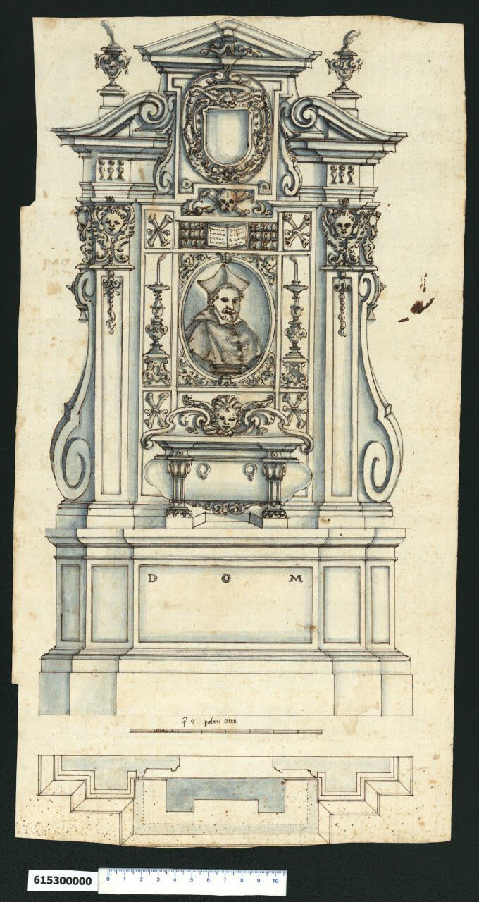 - NOTIZIE STORICO CRITICHE Nell'"Indice de due Tomi d'Intagli Tempietti ed altro", relativo ai tomi V e VI e compilato dal collezionista Giacomo Sardini, il disegno viene iscritto nel paragrafo "Mausolei sepolcrali" con la definizione "195 senza colonne".\nIl disegno è attribuito a Giovanni Battista Montano da Valeria Pracchi (1991, 2a parte, p. 23) su segnalazione di Anna Bedon. Alcune caratteristiche del disegno, che raffigura un monumento funebre, non ultima la presenza dell'acquerello azzurro, fanno ipotizzare che l'autore non sia Montano. All'interno della Collezione Sardini Martinelli di Milano (tomo VII), sono conservati alcuni disegni di Giovanni Battista Mola che maggiormente, per tecnica e soluzioni decorative, si avvicinano a quello oggetto della presente scheda. Sono piccoli dettagli come le ali molto appuntite dei cherubini (invv. 7,22; 7,48; 7,55-55bis), il particolare profilo delle volute, che non è lineare ma presenta al centro una "interruzione" (invv., 7,22; 7,40-41; 7,49; 7,52), il modo di disegnare e legare con un nastro le ossa incrociate (inv. 7,48).\nLa struttura si erge su un alto basamento posto su diversi piani di profondità. Due lesene rastremate verso il basso fiancheggiate da volute, dal particolare profilo interrotto da un segmento rettilineo, che reggono capitelli ornati da teste alate di cherubino e inquadrano il sarcofago con soprastante busto del defunto entro un ovale. L'apparato decorativo riveste tutto lo spazio a disposizione: attorno al busto sono disposti candelabri, ossa incrociate e un teschio. La trabeazione è interrotta per ospitare un cartiglio con stemma centrale sormontato da un timpano triangolare, delimitato ai lati da due volute arricciate.