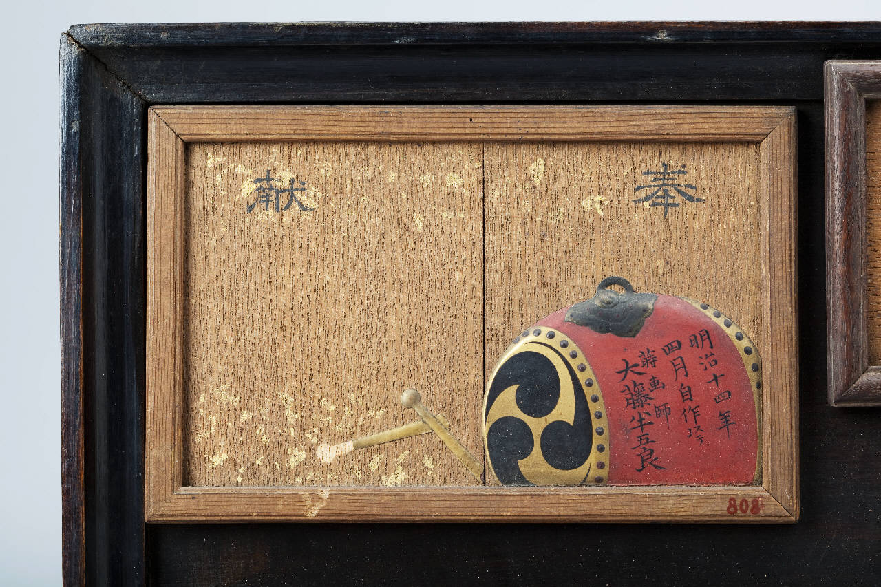 Tavoletta votiva in legno racchiusa entro cornice. All'interno, in rilievo laccato, dorato e dipinto, un tamburo da tempio decorato sul davanti con "motivo delle tre virgole" (mitsu tomo-e) e due bacchette. Sul corpo del tamburo iscrizione a inchiostro nero; in alto due ideogrammi.