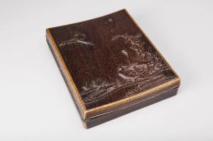 Scatola per calligrafia (suzuribako) in legno, rinforzata sui bordi da un supporto in bronzo. Coperchio scolpito con volatili. Interno laccato a rilievo (takamaki-e) su fondo a buccia di pera (nashiji) in oro e argento con decorazione di lago, battello, pagode e alberi. Include vaschetta, tavoletta per inchiostro e contenitore dell'acqua per sciogliere l'inchiostro (suiteki) in argento lavorato a incisione a forma di convolvolo (asagao).