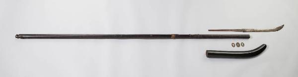 Falcione (naginata) con asta in legno laccato di nero omogeneo (roironuri); accessori in metallo.