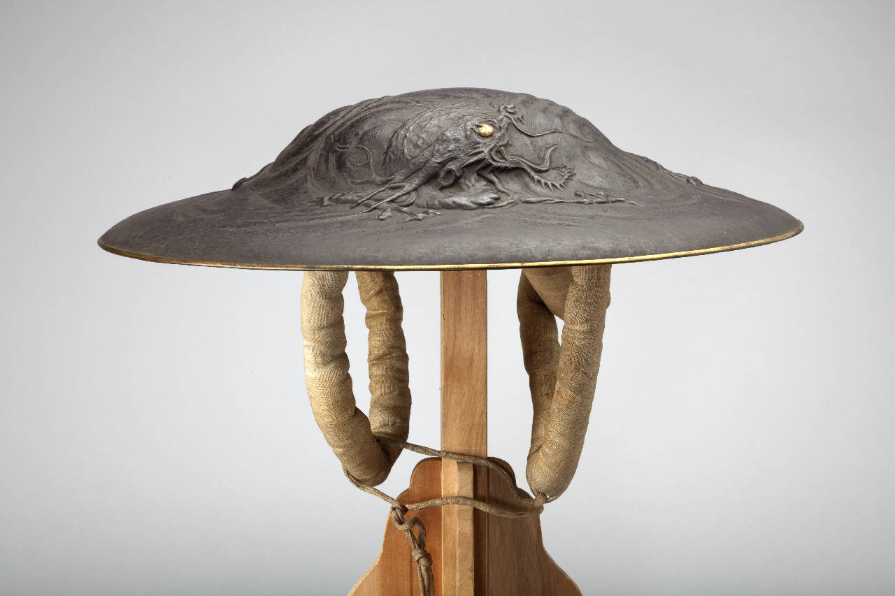Elmo di tipo jingasa in ferro lavorato a sbalzo per decoro di drago (ryu) tra le nubi; l'occhio dell'animale è dorato, la pupilla laccata di nero. Interno laccato di oro su base di lacca rossa. Cuscinetto di lino imbottito e allacciature.
