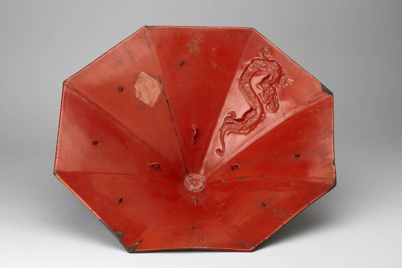 Elmo di tipo jingasa a cono a sezione ottagonale, in ferro lavorato a sbalzo per decoro di drago (ryu) tra le nubi. Interno laccato di rosso.