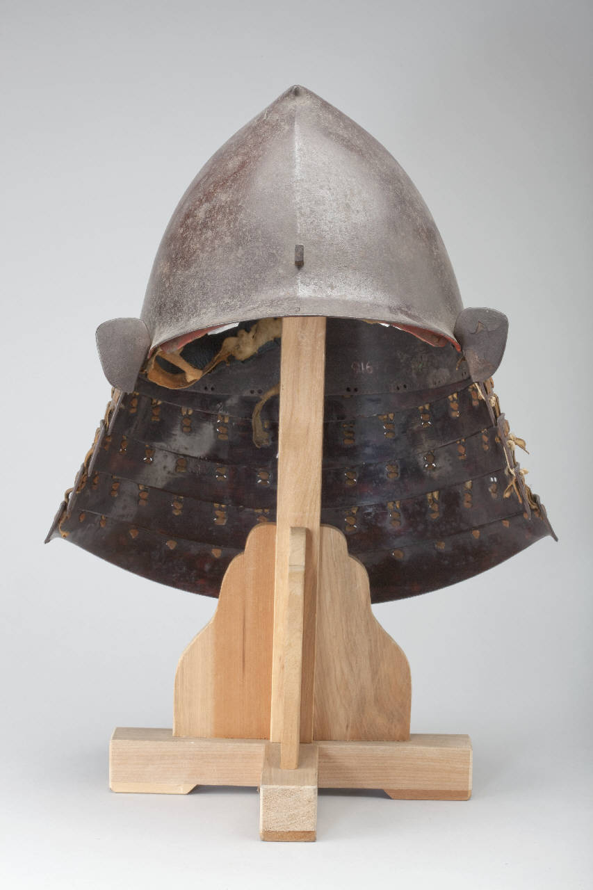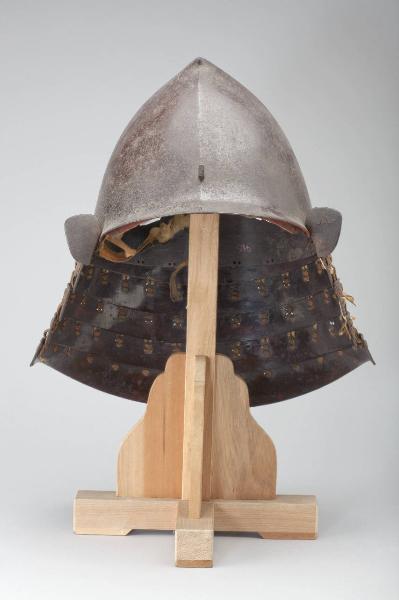 Elmo (kabuto) in ferro con interno in feltro. Collare a cinque lamine legate con filo di cuoio laccato di rosso.