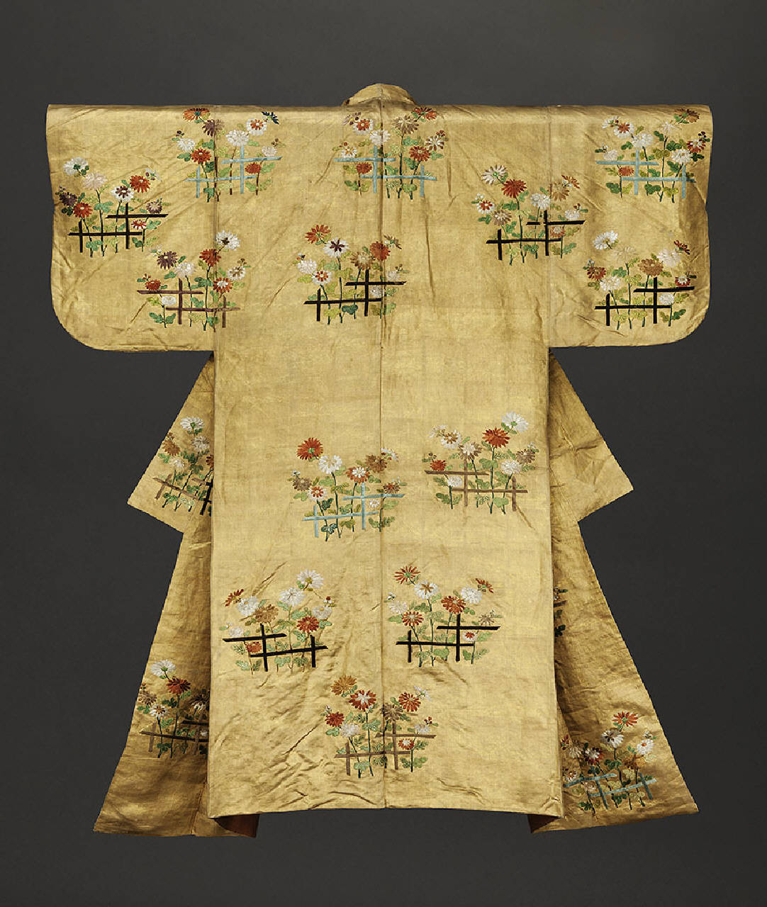 Costume per il teatro No di tipo nuihaku con maniche piccole. \nPer il fondo nuihaku, applicazione sul raso bianco di foglie d'oro. Per la decorazione ricamo policromo. Nuihaku con fondo oro (lamina applicata) con motivi policromi a ricamo, disposti in modo sparso (chirashi moyo), di recinti (due coppie di pali parallele incrociati perpendicolarmente) e crisantemi (kiku). Fodera color rosso e maniche piccole (kosode).