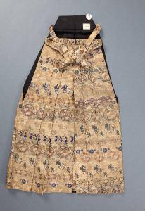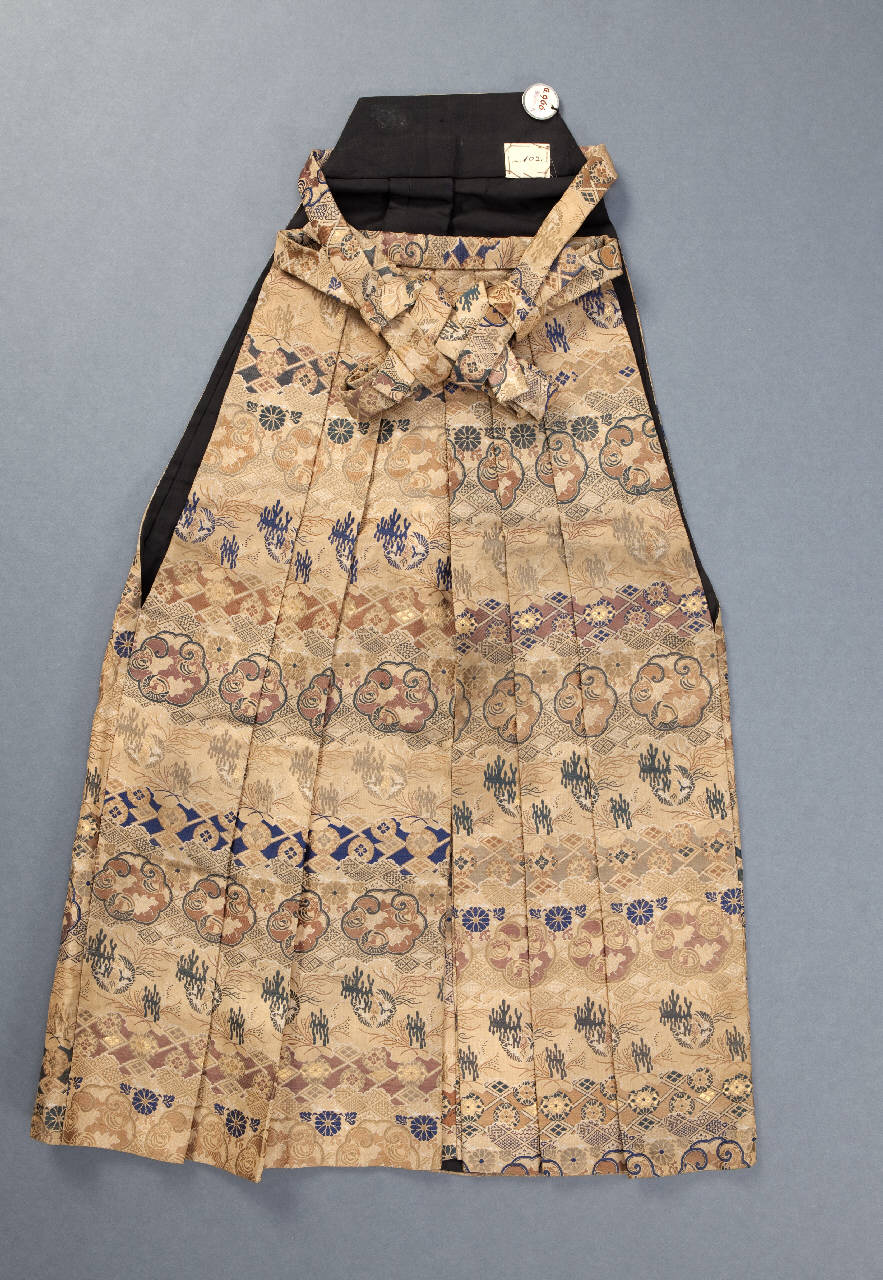 Tessuto in seta operata. Pantaloni (hakama) da uomo con fondo oro con disegni policromi disposti su linee orizzontali, parallele e sfalsate diagonalmente di draghetti (ryu) a tre artigli, nubi, fiori e fantasie geometriche. Interno in seta nera.