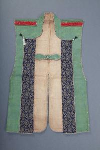 Sopravveste maschile senza maniche (jinbaori) in tessuto operato con trame supllementari in oro cartaceo e seta. Sull'esterno fondo verde lucido con motivo in verde opaco di grossi girali filiformi (karakusa) di grandi fiori di loto disposti su file parallele orizzontali e sfalsate diagonalmente. Sul fondo sono sparsi emblemi augurali (takara zukushi). Bordi a fondo blu con disegno in oro cartaceo di girali di draghetti (ryu) a tre artigli disposti su linee orizzontali, parallele e sfalsati diagonalmente. IL motivo è alternativamente rivolto in alto (a destra) e in basso (a sinistra). Sul fondo sono sparse nubi a forma di fungo (reishi kumo). L'interno è di colore giallo opaco e le spalline sono in rosso. Non ha stemma familiare (kamon).