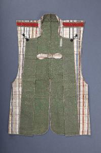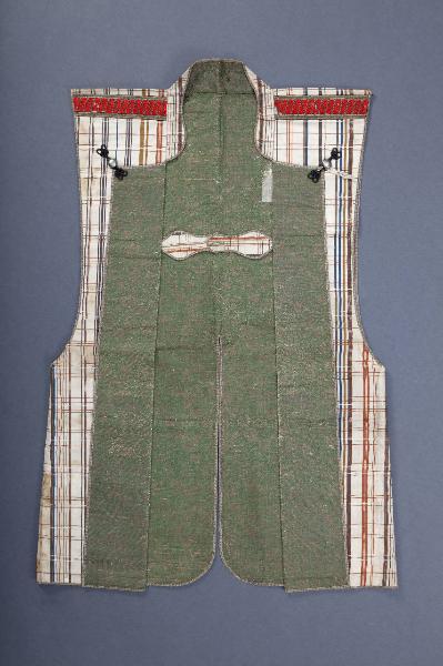 Sopravveste maschile senza maniche (jinbaori) in tessuto operato con trame supplementari in oro cartaceo e seta policroma. Sull'esterno fondo bianco con motivo di righe di vario colore (giallo, rosso, celeste e marrone) e diverse dimensioni che si intersecano con andamento parallelo e perpendicolare (koshi). Sui risvolti tessuto di seta operata con disegni policromi di girali filiformi (karakusa) a uno stelo (hitoe zuru) adorni di fogliame e peoni (?, il tessuto è rovinato e il motivo non è è ben visibile) di medie dimensioni (chu botan) in oro cartaceo, alternativamente rivolte in alto e in basso. Il motivo è disposto su file orizzontali, parallele e sfalsate diagonalmente. Spalline rosse. Sule retro, all'altezza delle spalle al centro, stemma familiare (kamon) con svastica all'interno di cornice circolare.