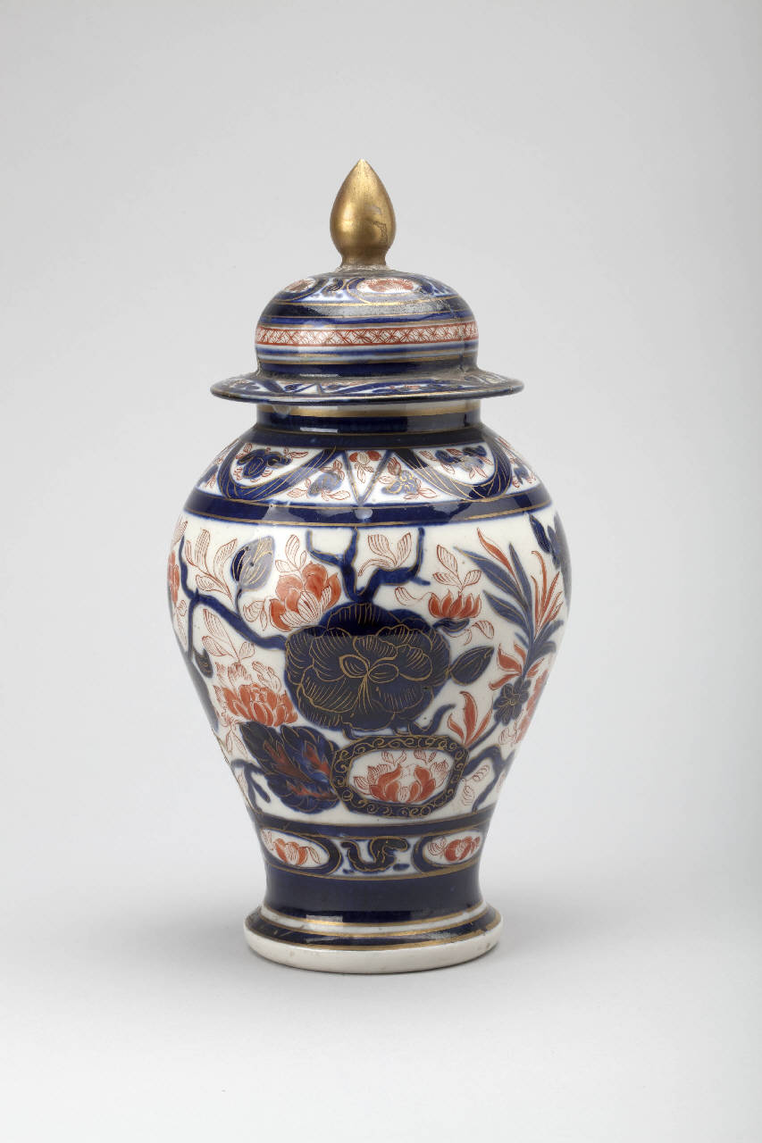 Vaso in porcellana a sezione circolare con spalla bombata e coperchio a calotta emisferica. La decorazione - dipinta in blu di cobalto steso al di sotto dell'invetriatura trasparente, smalto rosso e oro al di sopra della coperta - consiste in motivi vegetali e floreali. Il coperchio ha presa a forma di pomello.