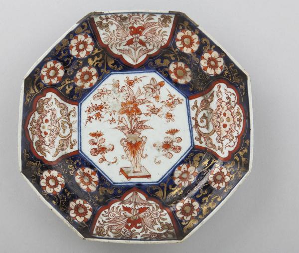 Piatto ottagonale in porcellana. Decorazione floreale dipinta in blu di cobalto steso al di sotto dell'invetriatura trasparente, smalto rosso e diffusi tocchi di oro al di sopra della coperta.