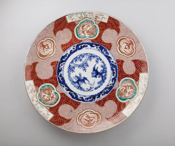 Piatto circolare in porcellana. La decorazione - dipinta in blu di cobalto steso al di sotto dell'invetriatura trasparente, smalti rosso e verde e diffusi tocchi di oro al di sopra della coperta - consiste in un grande medaglione circolare al centro del fondo con una composizione vegetale, intorno al quale si sviluppa un tappeto di motivi vegetali e geometrici interrotto da medaglioni circolari con draghi e uccelli. Sul retro, sulla tesa, tralcio vegetale.